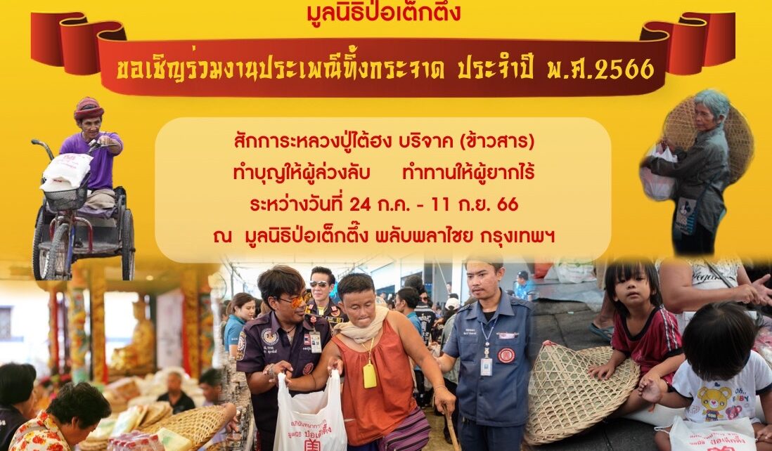 มูลนิธิป่อเต็กตึ๊ง ขอเชิญผู้มีจิตศรัทธาร่วมงานมหาบุญ งานมหากุศลครั้งยิ่งใหญ่ ในประเพณีทิ้งกระจาด ประจำปี 2566 “ทำบุญอุทิศส่วนกุศลให้ผู้ล่วงลับ พร้อมทำทาน” ให้แก่ผู้ยากไร้ ณ มูลนิธิป่อเต็กตึ๊ง พลับพลาไชย กรุงเทพฯ