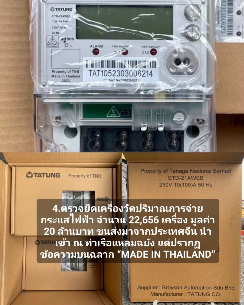 - ตรวจยึดเครื่องวัดปริมาณการจ่ายกระแสไฟฟ้า จำนวน 22,656 เครื่อง มูลค่า 20 ล้านบาท ขนส่งมาจากประเทศจีน นำเข้า ณ ท่าเรือแหลมฉบัง แต่ปรากฏข้อความบนฉลาก “MADE IN THAILAND”