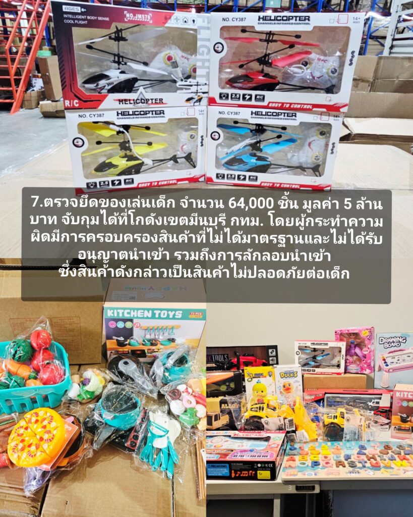 การลักลอบนำเข้า และการหลีกเลี่ยงภาษีศุลกากร - ตรวจยึดของเล่นเด็ก จำนวน 64,000 ชิ้น มูลค่า 5 ล้านบาท จับกุมได้ที่โกดังเขตมีนบุรี กทม. โดยผู้กระทำความผิดมีการครอบครองสินค้าที่ไม่ได้มาตรฐานและไม่ได้รับอนุญาตนำเข้า รวมถึงการลักลอบนำเข้า