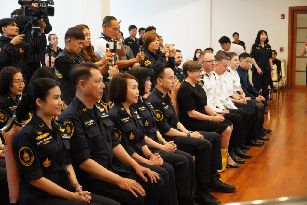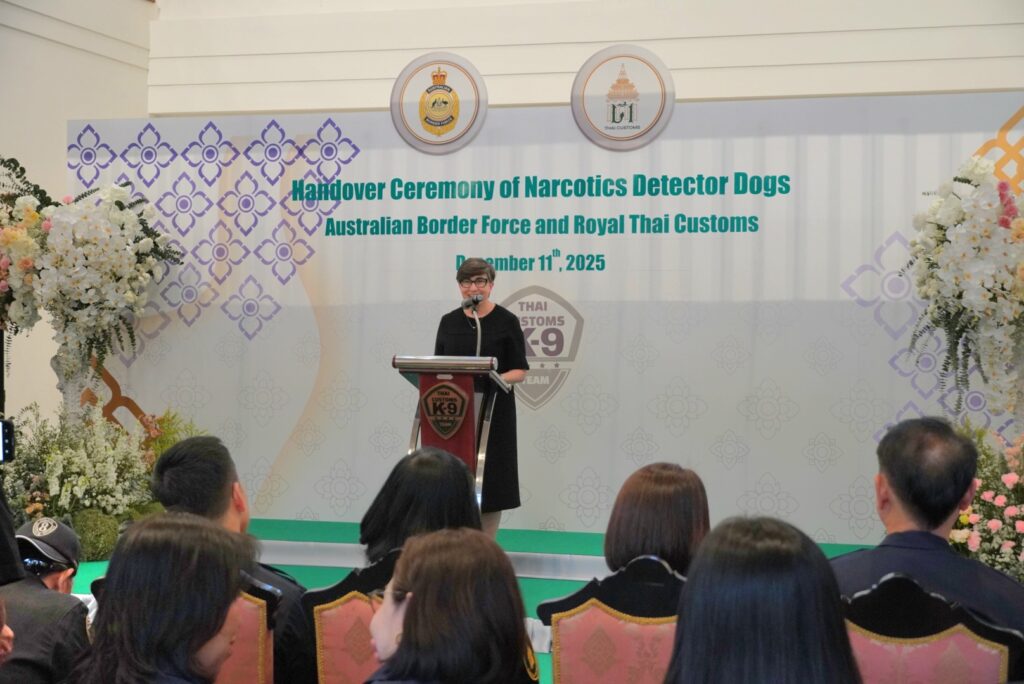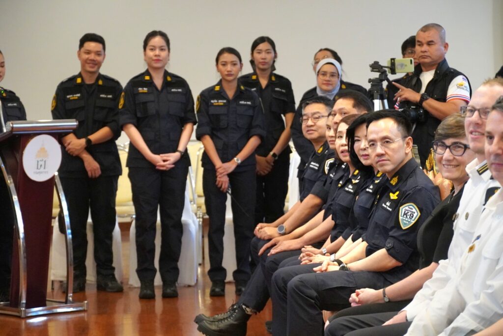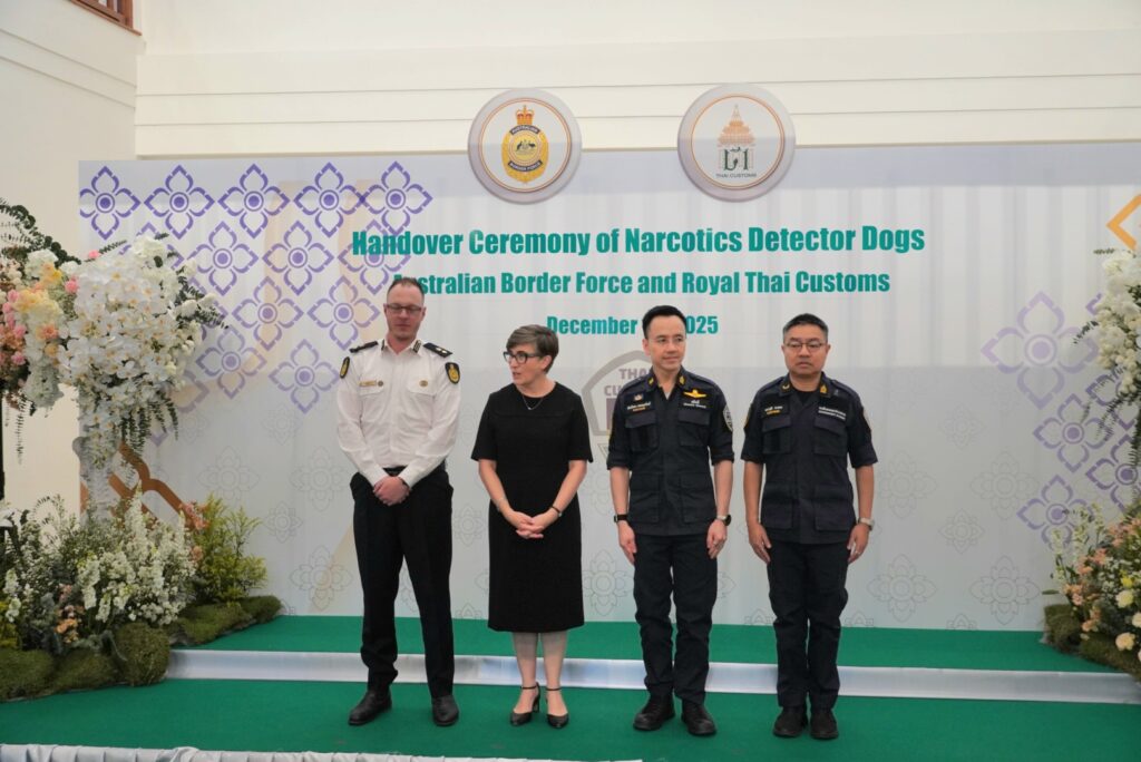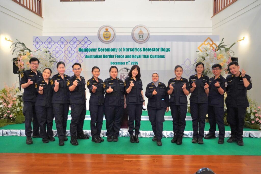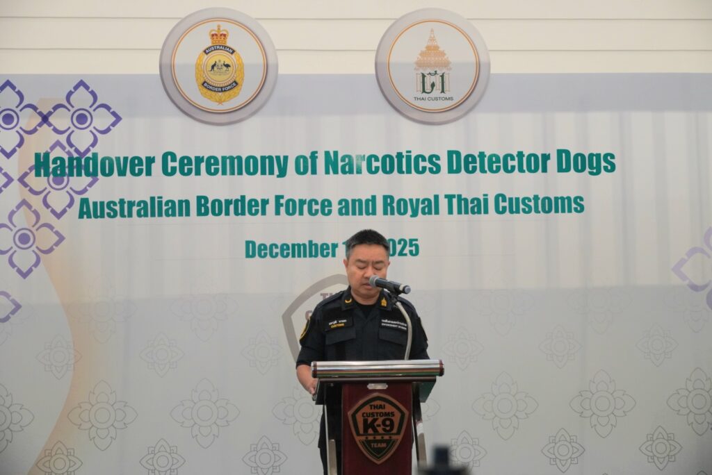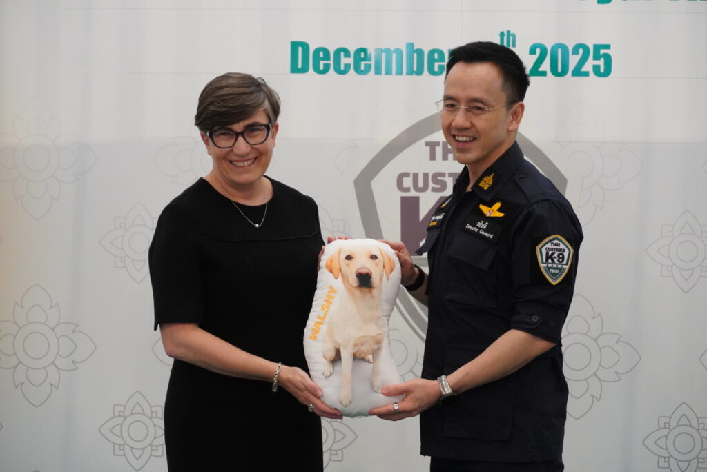 และเจ้าหน้าที่จาก ABF เข้าร่วมพิธี ซึ่งการมอบสุนัขตรวจค้นในครั้งนี้ เป็นความร่วมมือระหว่างกรมศุลกากร และสำนักงานพิทักษ์เขตแดนแห่งออสเตรเลีย ภายใต้โครงการ ABF – Thai Customs Detector Dog Cooperation 2024–2027 ซึ่งเป็นความร่วมมือด้านการพัฒนาศักยภาพ ความเชี่ยวชาญ องค์ความรู้ ทักษะ และเทคนิคต่าง ๆ ให้แก่ทีมสุนัขตรวจค้นของกรมศุลกากรในการร่วมปฏิบัติภารกิจด้านการสืบสวนและปราบปรามให้มีมาตรฐานระดับสากล