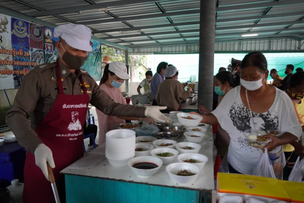 ก๋วยเตี๋ยวหมูตุ๋น ด้วยตนเอง พร้อมทั้งแจกอาหารให้กับมือพี่น้องประชาชนในชุมชนแสงศิริ