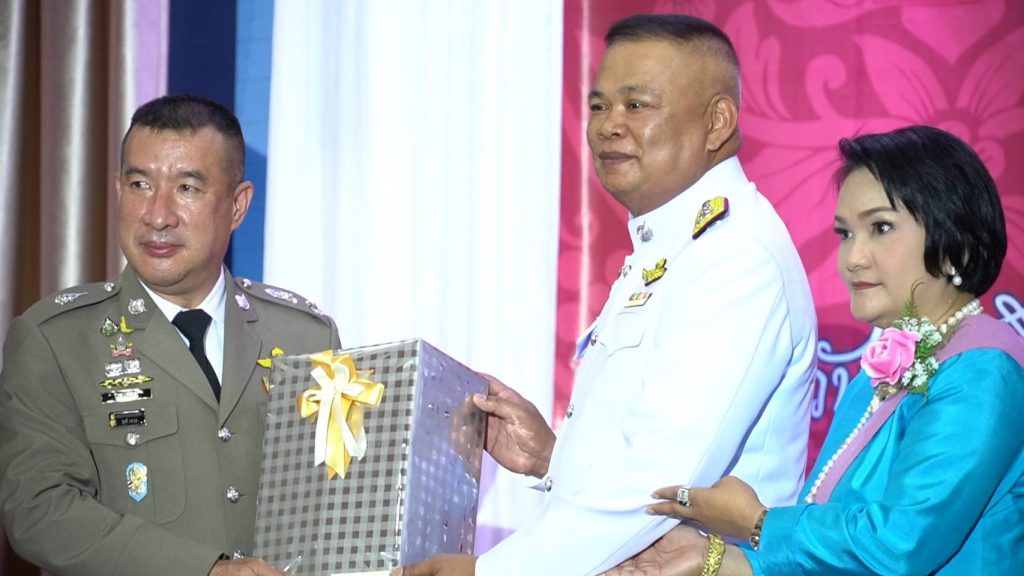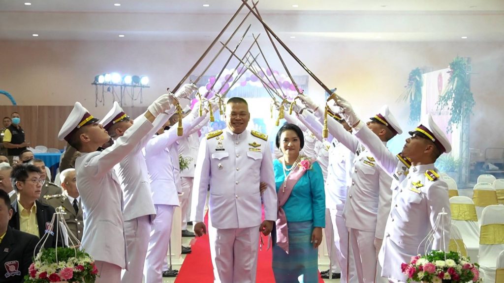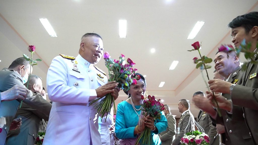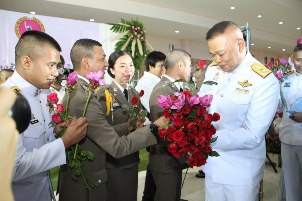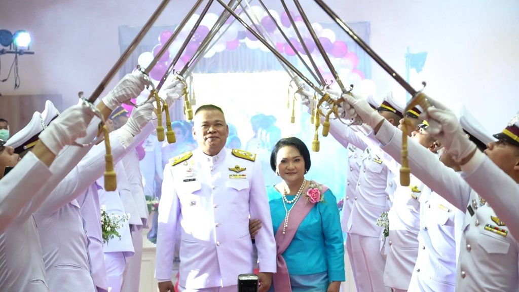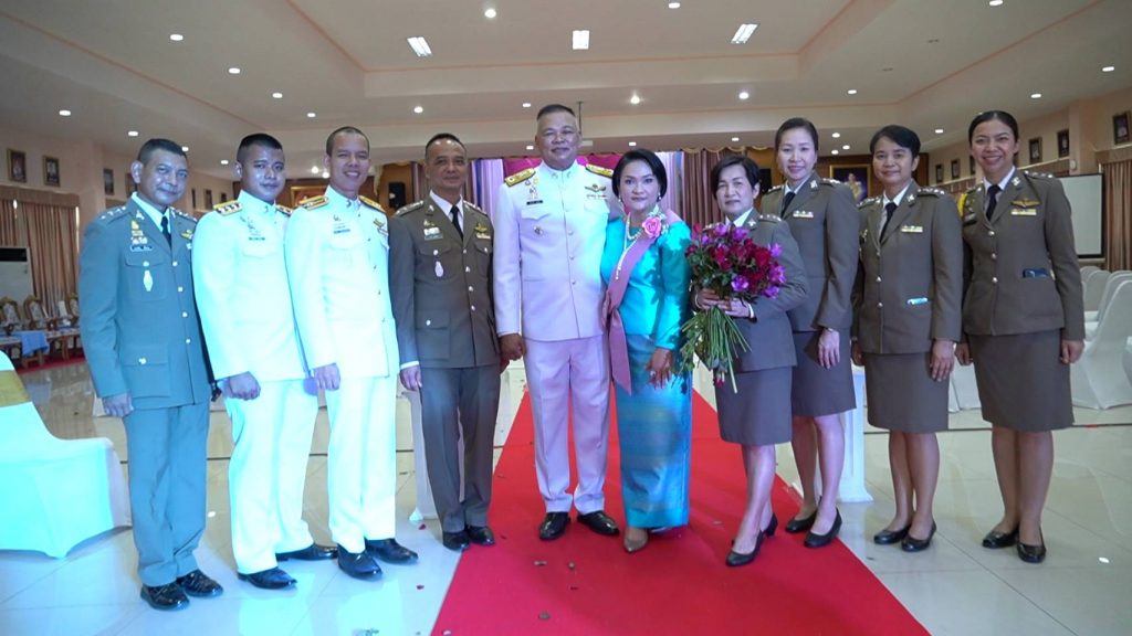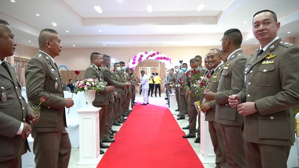 จากนั้นผู้เกษียณพร้อมคู่สมรส เดินตามพรมแดง ลอดซุ้มกระบี่ ทีละคู่ ผู้บังคับบัญชา พร้อมเพื่อนข้าราชการตำรวจ มอบดอกกุหลาบแก่ผู้เกษียณ โดยพิธีการดังกล่าวจัดขึ้นได้อย่างสวยงานและสมเกียรติ