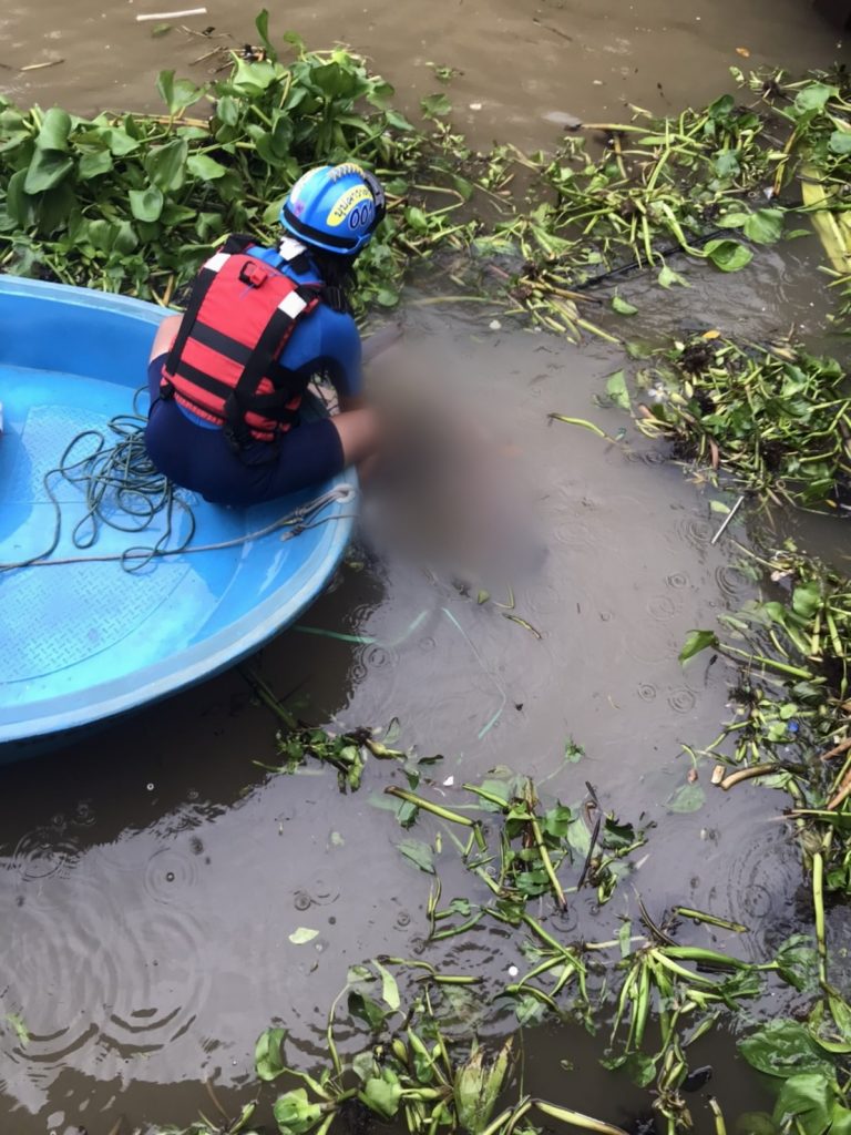 เมื่อเจ้าหน้าที่และอาสาสมัครไปถึงที่เกิดเหตุ พบท่อนขาโผล่มาในกองผักตบชวา จึงได้ผูกมัดไว้แล้วลากจูงไปขึ้นท่าน้ำใต้สะพานพุทธ พบเป็นหญิง 1 ราย สวมใส่เสื้อเปิดไหล่ลายสก๊อตสีเขียว เสื้อชั้นในสีดำ กระโปรงสีดำ กางเกงชั้นในสีดำ ไม่สวมรองเท้า ผมยาวประบ่า สูงประมาณ 160-165 อายุประมาณ 30-35 ผิวขาว รูปร่างอวบ ไม่มีร่องรอยบาดแผลใดๆ