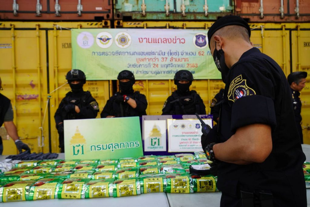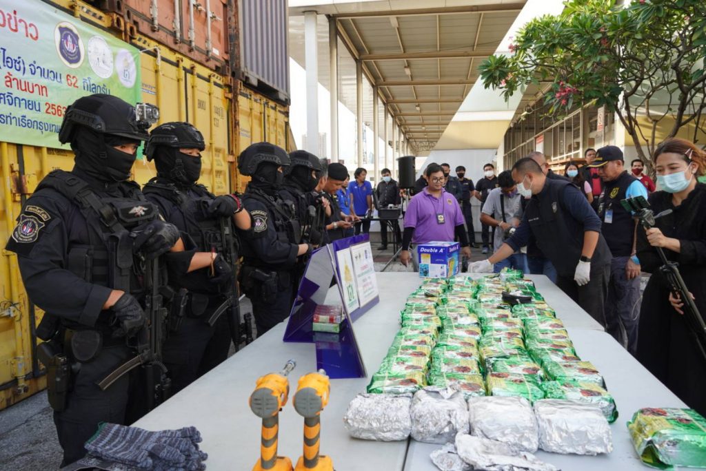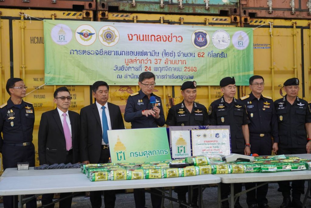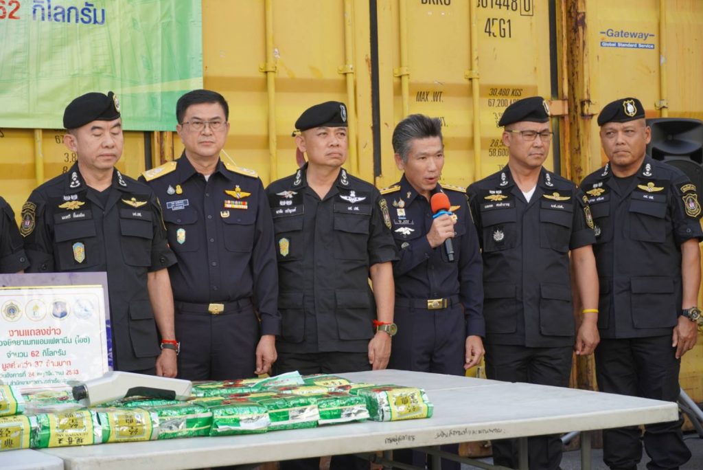 รอง ผบ.ตร. พล.ต.ท. ชินภัทร สารสิน ผู้ช่วย ผบ.ตร. พล.ต.ท. มนตรี ยิ้มแย้ม ผบช.ปส. พล.ท. กนกพงษ์ จันทร์นวล ผบ.ศรภ. เรือโท กมลศักดิ์ พรหมประยูร ผู้อำนวยการการท่าเรือแห่งประเทศไทย และนายบัณฑิต สาครวิศวะ ผู้อำนวยการท่าเรือกรุงเทพ ได้ร่วมกันแถลงข่าวการตรวจยึดยาเสพติดให้โทษประเภท 1 เมทแอมเฟตามีน (ไอซ์) น้ำหนักรวมสิ่งห่อหุ้มประมาณ 62 กิโลกรัม มูลค่าประมาณ 37 ล้านบาท
