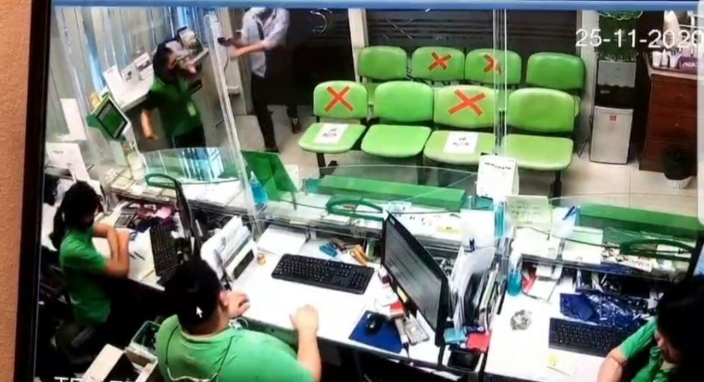 เมื่อพนักงานวิ่งหนีตายไปแล้ว คนร้ายก็ได้ทำการรื้อแผ่นอะครีลิกแบบใส ซึ่งทางธนาคารติดตั้งไว้กั้นรักษาระยะห่าง ระหว่างพนักงานกับลูกค้าตามมาตรการป้องกันโควิด-19