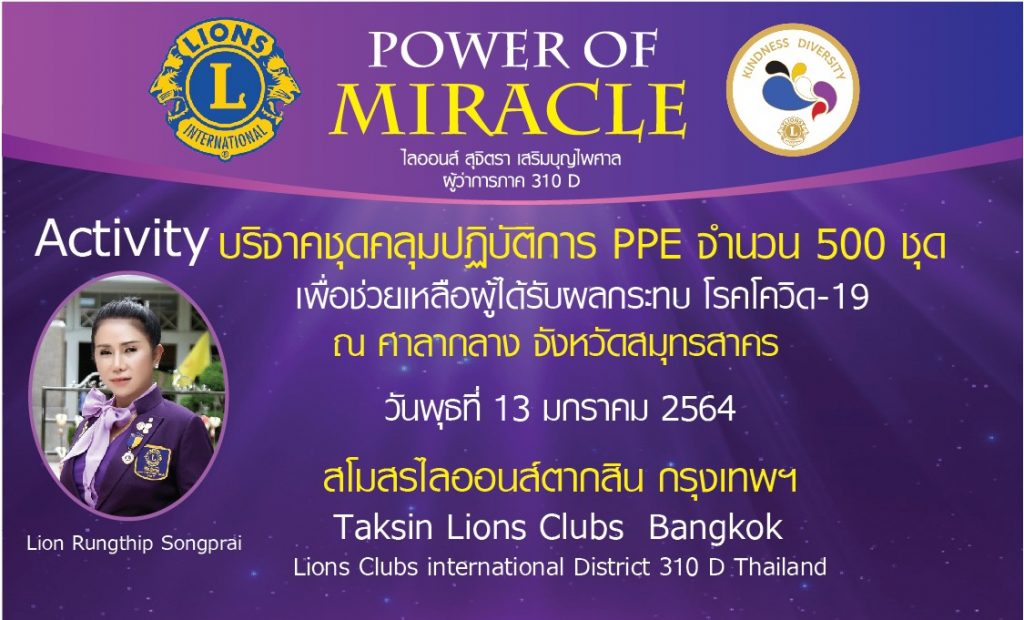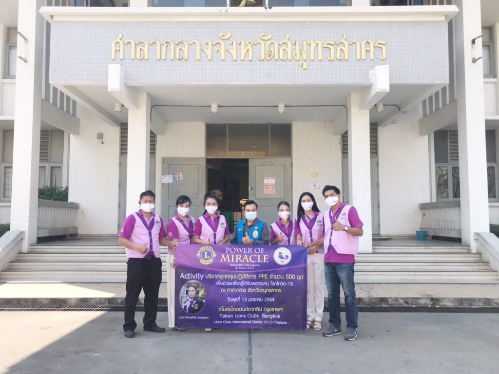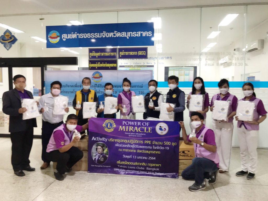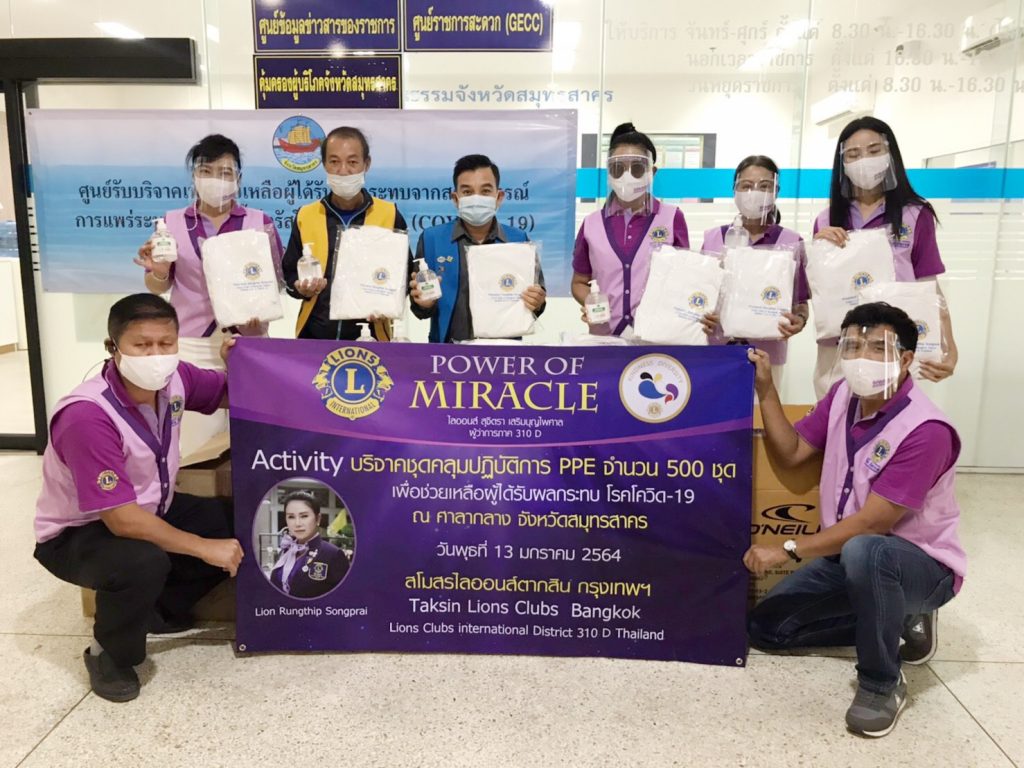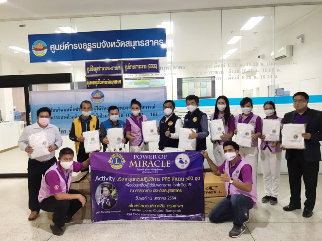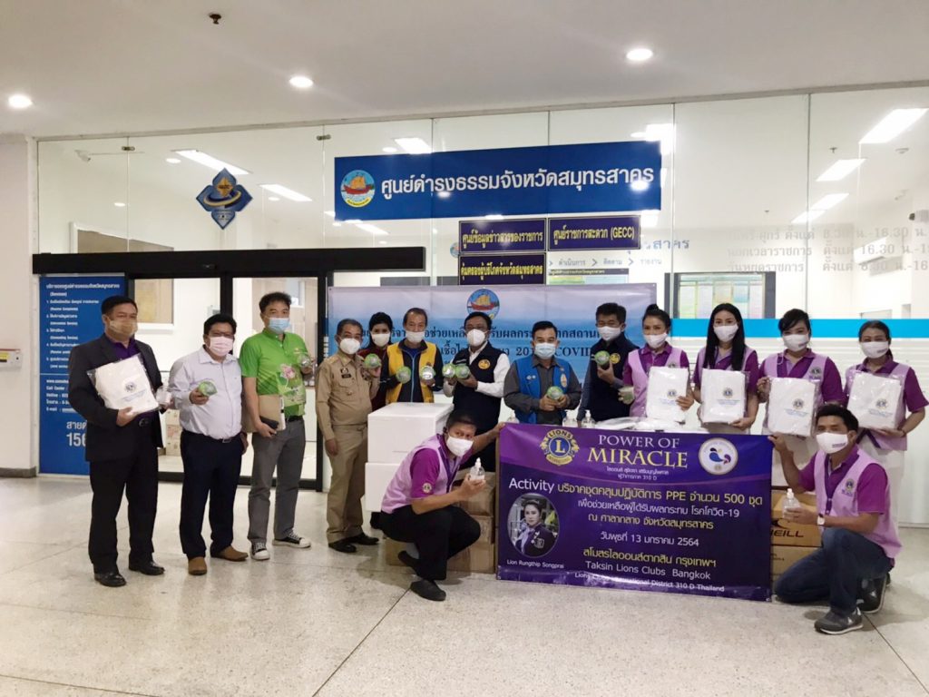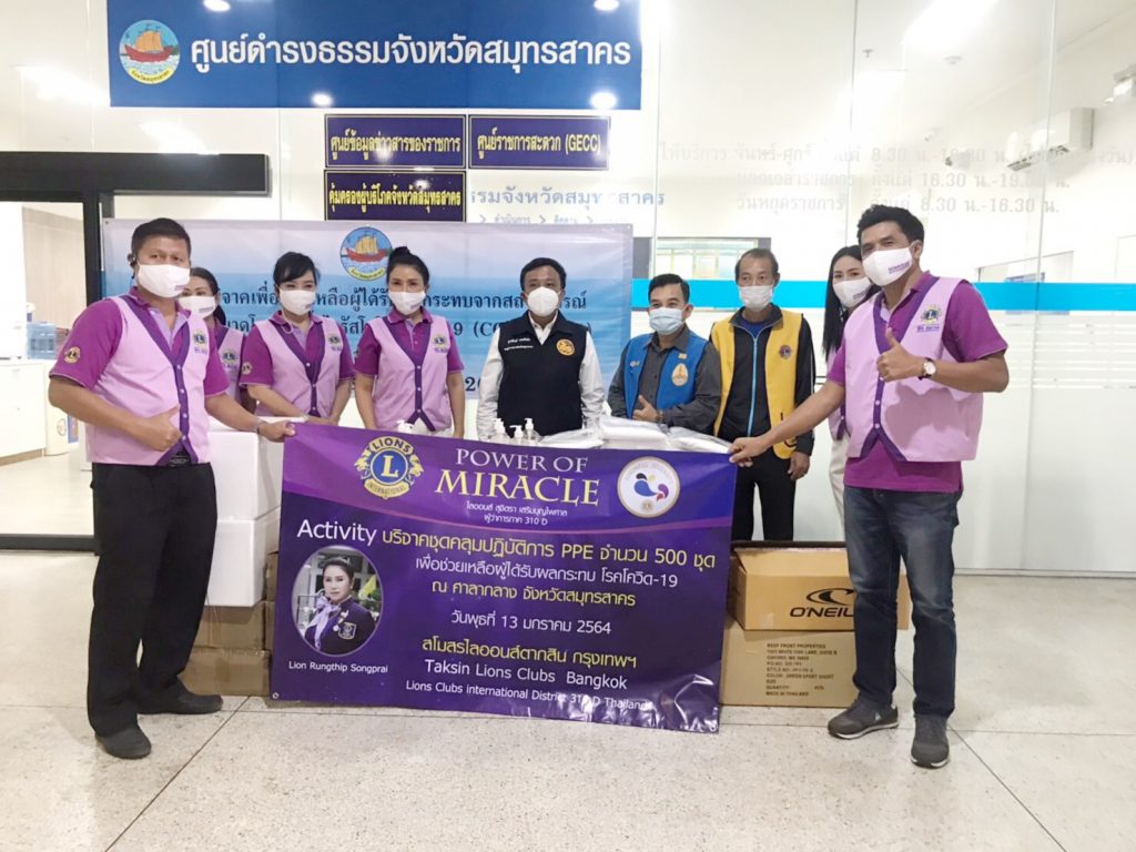 วันนี้ 13 ม.ค.64 เวลา 13.00 น สโมสรไลออนส์ ตากสิน กรุงเทพ310D นำโดย คุณรุ่งทิพย์ ส่องพราย นายกสมาคมสโมสรไลออน์ ตากสิน กรุงเทพ310D/ประธานเขต 1 พร้อมด้วย คุณดวงมณี, คุณจุฑามาศ, คุณไสว พลขันธ์ ,คุณพนม มาลานนท์, คุณวิมล,คุณแอ๋ว (เจ้าของลอดช่อง สยาม), ว่าที่ร.ต.ธีระภัทร์ รุ่งราตรี ร.น. รองผู้ว่าการภาคคนที่2 (ร่วมบริจาคเจลแอลกอฮอลล์ 120 ขวด), คุณพัชรินทร์ ร่วมด้วยสมาชิกไลออนส์ และผู้ทรงเกียรติ ได้ร่วมกันนำชุดคลุมปฏิบัติการ PPE จำนวน 500 ชุด ไปมอบให้กับแพทย์ บุคลากรทางการแพทย์ ผู้ดูแลรักษาผู้ป่วยโควิด-19 ณ.ศาลากลาง จังหวัดสมุทรสาคร เพื่อที่จะนำไปแจกจ่ายให้ตามจุดต่าง ๆ ของโรงพยาบาลสนาม ในจังหวัดสมุทรสาคร เพื่อใช้ในการป้องกัน และใช้ในการดูแลผู้ป่วยติดเชื้อไวรัสโควิด-19 ต่อไป