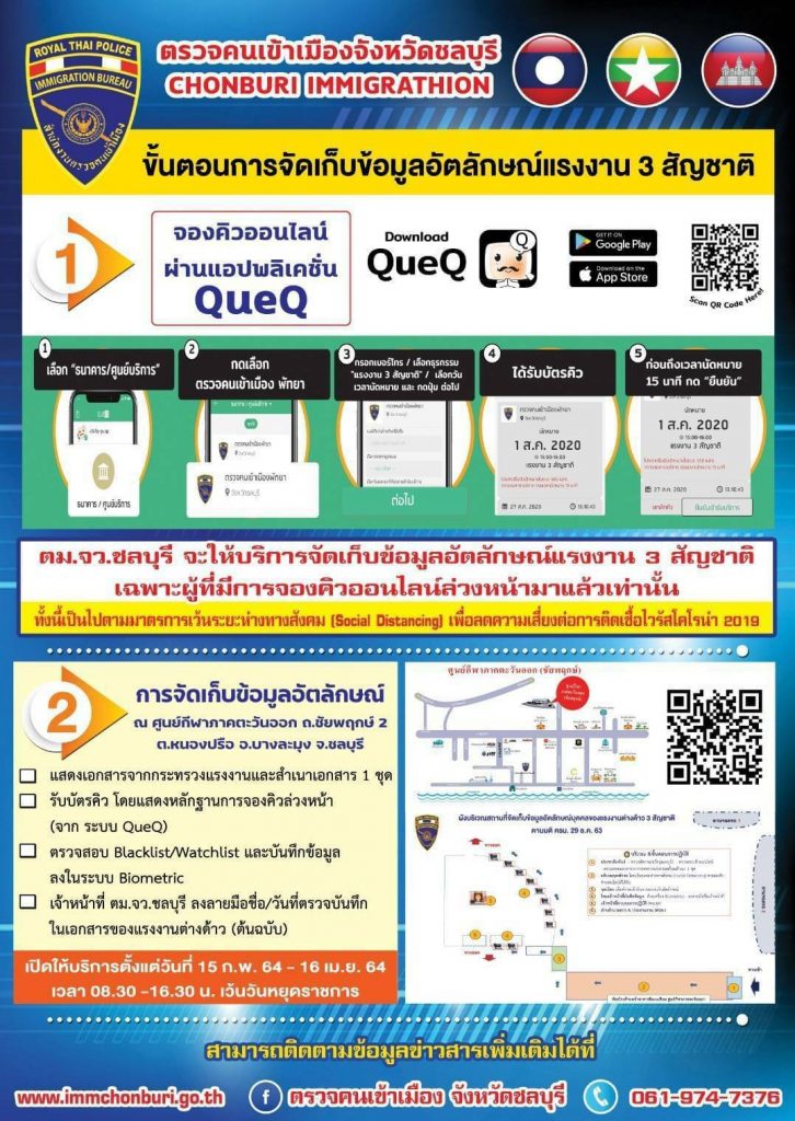 สำหรับแรงานต่างด้าว 3 สัญชาติ ได้แก่ เมียนมา ลาว กัมพูชา ตามติ ครม.ดังกล่าวในพื้นที่ จว.ชลบุรี ที่ผ่านลงทะเบียนกับกรมจัดหางานแล้ว ให้จองคิวออนไลน์ ผ่านแอปพลิเคชั่น QueQ เท่านั้น และเมื่อดำเนินการจองคิวออนไลน์เรียบร้อยแล้ว ให้คนต่างด้าวมาดำเนินการจัดเก็บอัตลักษณ์บุคคลให้แล้วเสร็จภายในกำหนดเวลา โดยจะเปิดดำเนินการ ตั้งแต่วันที่ 15 ก.พ.64 ถึงวันที่ 16 เม.ย.64 ระหว่างเวลา 08.30 – 16.30 น. ยกเว้นวันหยุดราชการ ณ ศูนย์กีฬาแห่งชาติภาคตะวันออก ถนนชัยพฤกษ์ 2 ต.หนองปรือ อ.บางละมุง จว.ชลบุรี