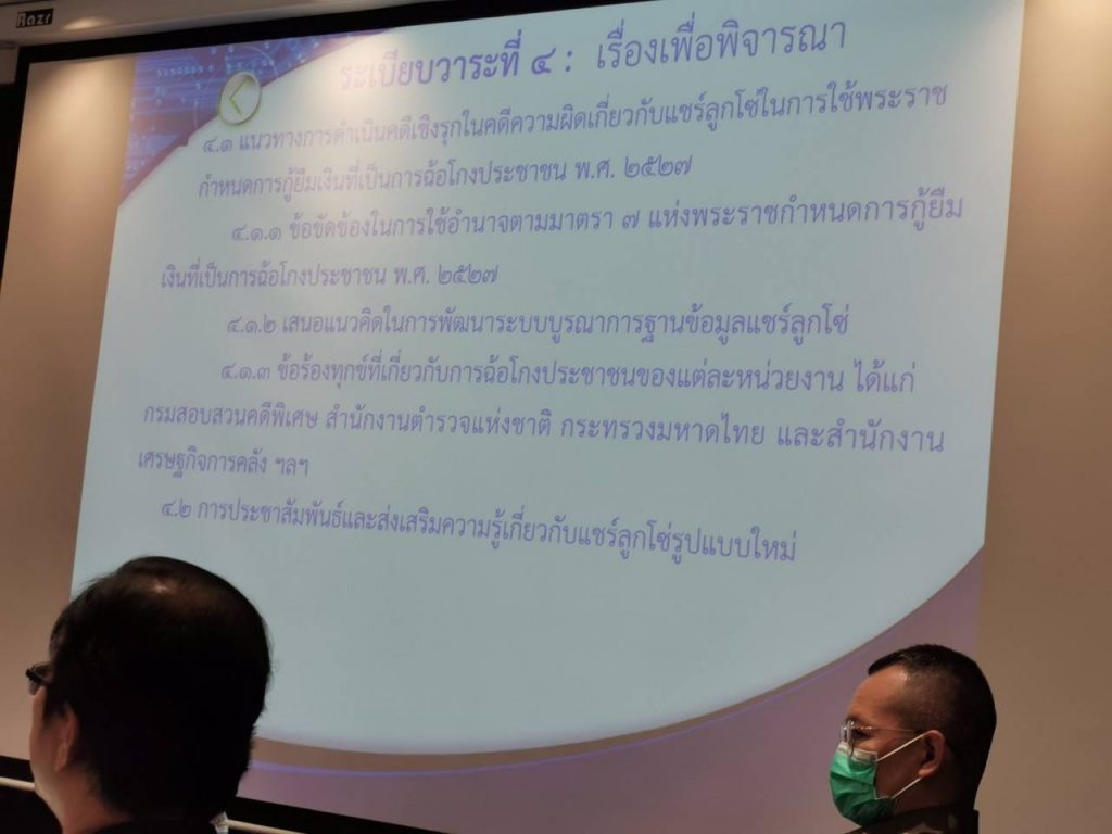 -แนวคิดในการจัดทำฐานข้อมูลการดำเนินการเรื่องแชร์ลูกโซ่ -แนวทางการส่งเสริมความรู้เกี่ยวกับแชร์ลูกโซ่และขั้นตอนการดำเนินคดี
