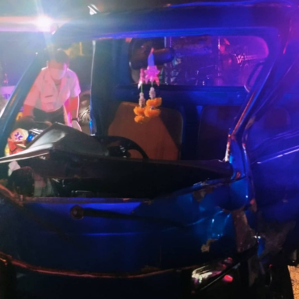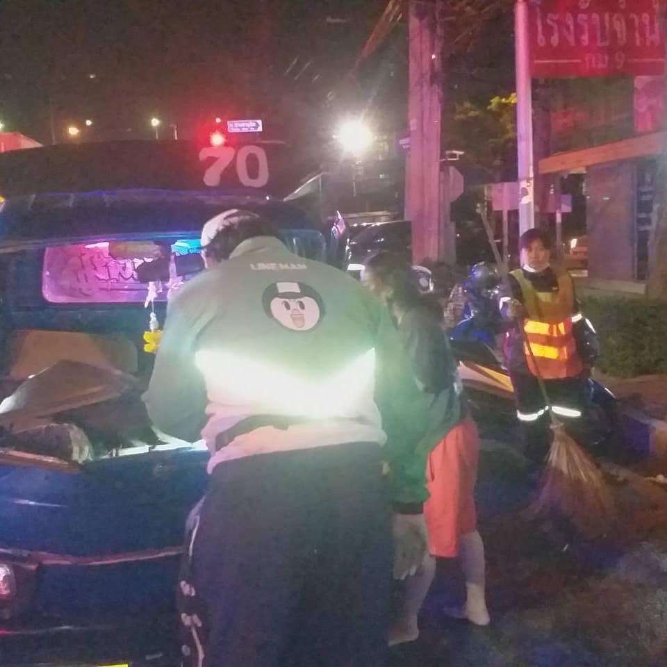 เมื่ออาสาสมัครมาถึงที่เกิดเหตุพบว่าจุดเกิดเหตุ เป็นบริเวณกลางแยก กม.9 ขาเข้ามุ่งหน้า ถนน ประชาอุทิศ แขวงราษฎร์บูรณะ เขตราษฎร์บูรณะ จังหวัด กรุงเทพมหานคร พบรถตู้ยี่ห้อโตโยต้า สีขาว ทะเบียน นข 7944 อุบลราชธานี ในสภาพกันชนด้านหน้าเสียหายพังยับเยิน แล้วใกล้กันพบกับรถซูบูลุ ยี่ห้อซูซูกิ สีน้ำเงิน ทะเบียน ฟง 185 กรุงเทพมหานคร ( ป้ายเหลือง ) เป็นรถดัดแปลงมาเป็นรถนั่งประจำทางสาธารณะ สาย 70 ระยะวิ่งพุทธบูชา – บางประกอก เสียหายตรงบริเวณคอนโซลหน้ายุบติดกับเบาะคนขับ และ ยังมีรถจักรยานยนต์ ยี่ห้อฮอนด้าเวฟ 125 i สีน้ำเงิน คาดดำ ทะเบียน 1 กส 3621 กรุงเทพมหานคร เสียหายล้มตะแคงอยู่ แล้วภายในที่เกิดเหตุยังมีผู้บาดเจ็บติดอยู่ที่คอนโซลหน้ารถซูบูลุซึ่งเป็นคนขับรถทราบชื่อ ต่อมาชื่อ นาย แหลมทอง อายุ 42 ปี อาการสาหัส ขาติดที่คอนโซลหน้า นำตัวออกจากรถไม่ได้ ต้องประสานขอรถอุปกรณ์ตัดถ่างช่วยเหลือออกมา กู้ชีพบางประกอก 1 รับดำเนินการ และทางคนนั่งข้างคนขับ บาดเจ็บเป็นหญิง 1 ราย ชื่อ น.ส.สุพัตรา อายุ 40 ปี อาสานำส่ง รพ.บางปะกอก 1 ส่วนทางรถจักรยานยนต์ บาดเจ็บ 2 ราย เป็นชาย 1 ราย หญิง 1 ราย ชื่อนาย ศุภกิจ อายุ 27 ปี เป็นคนขี่ และ น.ส. เพียรทอง อายุ 50 ปี เป็นคนซ้อน อาสานำส่ง รพ.บางปะกอก 1
