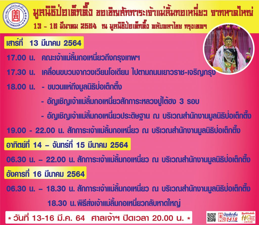 ระหว่างวันที่ 13 – 16 มีนาคม 2564 มูลนิธิป่อเต็กตึ๊ง ร่วมกับมูลนิธิมิตรภาพสามัคคี (ท่งเซียเซี่ยงตึ๊ง) หาดใหญ่ ขอเชิญศิษยานุศิษย์ และสาธุชนที่เลื่อมใสร่วมสักการะเจ้าแม่ลิ้มกอเหนี่ยว จากหาดใหญ่ องค์แป๊ะกง และองค์หล่าจา ใน ณ บริเวณลานสำนักงาน มูลนิธิป่อเต็กตึ๊ง พลับพลาไชย กรุงเทพฯ โดยวันเสาร์ที่ 13 มีนาคม 2564 เวลา 17.00 น. คณะเจ้าแม่ลิ้มกอเหนี่ยวเดินทางถึงกรุงเทพฯ ผ่านบริเวณวงเวียนโอเดียน ไปตามถนนเยาวราช – เจริญกรุง โดยขบวนจะแห่ถึงมูลนิธิป่อเต็กตึ๊ง เวลาประมาณ 18.00 น. และในวันที่ 14-15 มีนาคม 64 มูลนิธิ
