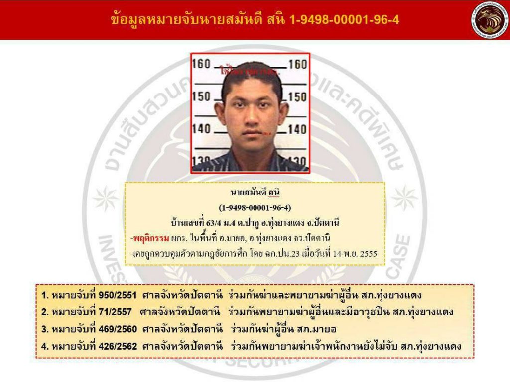 จากการเข้าตรวจสอบ คนร้ายที่เสียชีวิตทราบชื่อคือ นายสมันดี สนิ ผู้ก่อเหตุรุนแรงเคลื่อนไหวใน พื้นที่ อ.ทุ่งยางแดง จังหวัดปัตตานี มีหมาย ป.วิ อาญา จำนวน 4 หมายข้างศพพบปืนพกขนาด 9 มม. จำนวน 1 กระบอก พร้อมกระสุน