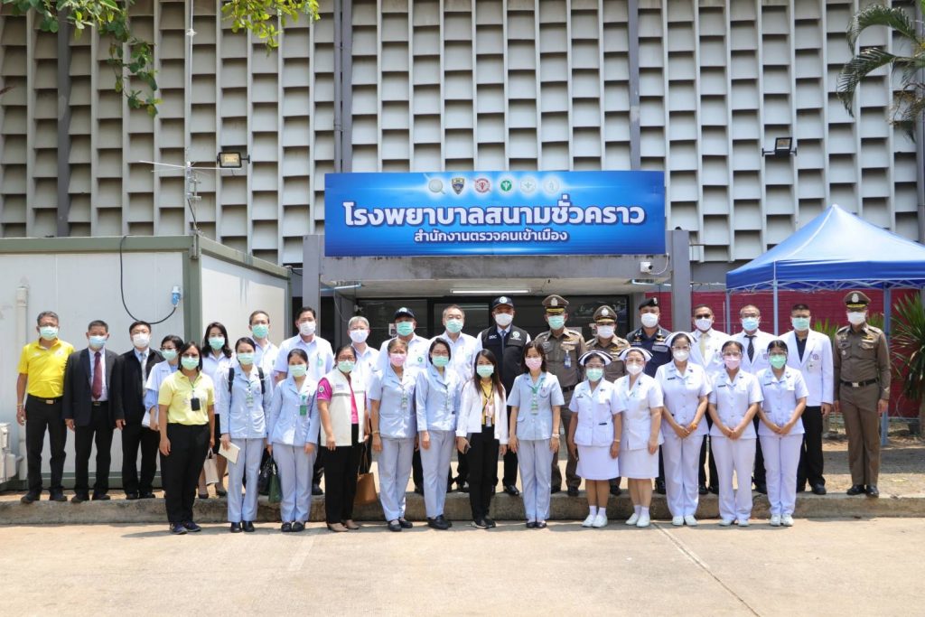 สืบเนื่องจากสถานการณ์ผู้ต้องกักติดเชื้อไวรัส Covid 19 จำนวน ทั้งสิ้น 393 คน (ชาย 370 คน, หญิง 23 คน) ถูกแยกกักตัว ณ รพ.สนามชั่วคราวในห้องกัก(บางเขน) โดย สตม. ได้จัดตั้ง รพ.สนามชั่วคราว สตม. ณ อาคารโรงยิมกองสวัสดิการ ตร. ในพื้นที่สโมสรตำรวจ จัดตั้งขึ้นโดยการประสานความร่วมมือกับ รพ.ตร. (จัดส่งบุคลาการทางการแพทย์), กระทรวงสาธารณสุข กรมควบคุมโรค กรมการแพทย์ สถาบันป้องกันควบคุมโรคเขตเมือง ให้คำปรึกษา แนะนำและกำหนดมาตรฐานของการจัดตั้ง รพ.สนาม, มาตรฐานของการตรวจควบคุมโรค สนับสนุนอุปกรณ์ทางการแพทย์ และในส่วนของ กรุงเทพมหานครให้การสนับสนุนด้านการรักษาความสะอาด และสาธารณูปโภค