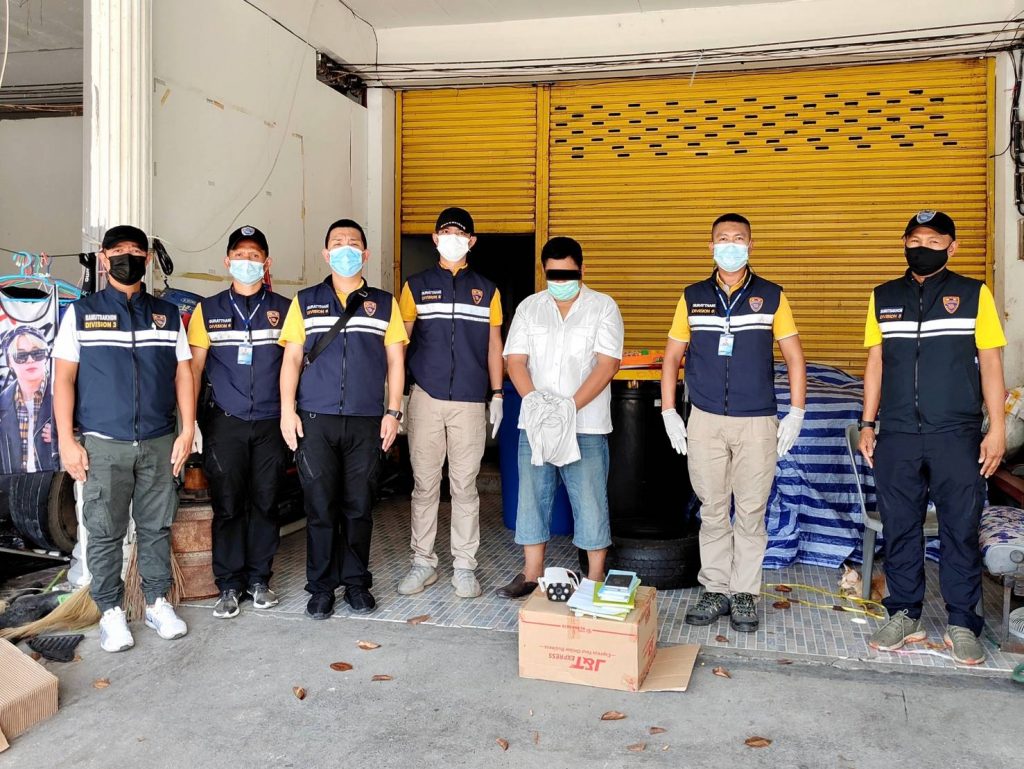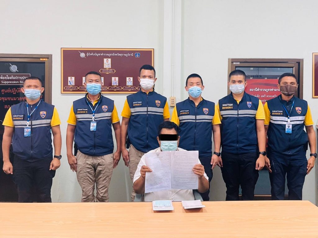 19 เมษายน 2564 ภายใต้การอำนวยการของ พล.ต.ต.สุเมธ เมฆขจร ผบก.ตม.6 , พ.ต.อ.ศุภฤกษ์ พันธ์โกศล ผกก.ตม.จว.สุราษฎร์ธานี เจ้าหน้าที่ตำรวจ ตม.จว.สุราษฎร์ธานี นำโดย พ.ต.ท.ชาตรี ชูแก้ว รอง ผกก.ตม.จว.สุราษฎร์ธานี , พ.ต.ท.ธีระวัฒน์ อำนาจเจริญยิ่ง สว.ตม.จว.สุราษฎร์ธานี , ร.ต.อ.สิริวัฒน์ สมหวัง รอง สว.ตม.จว.สุราษฎร์ธานี , ด.ต.พงษ์ศักดิ์ พัฒน์คง และ ด.ต.รังสรรค์ ศรีเมือง ผบ.หมู่ ตม.จว.สุราษฎร์ธานี ร่วมกันสืบสวนขยายผล กรณีจับกุมขบวนการลักลอบขนแรงงานต่างด้าวผิดกฎหมาย จนกระทั่งสามารถขออนุมัติศาลจังหวัดไชยาออกหมายจับ Mr.Kyaw Thet OO หรือนายจอเท็ทอู ในความผิดฐาน “เป็นผู้ใช้ให้ผู้อื่นให้คนต่างด้าวเข้าพักอาศัย ซ่อนเร้น หรือช่วยเหลือด้วยประการใดๆ เพื่อให้คนต่างด้าวนั้นพ้นจากการจับกุม โดยรู้ว่าคนต่างด้าวนั้นเข้ามาในราชอาณาจักรโดยผิดกฎหมาย” ตามหมายจับศาลจังหวัดไชยา ที่ จ.24/2564 ลงวันที่ 16 เมษายน 2564