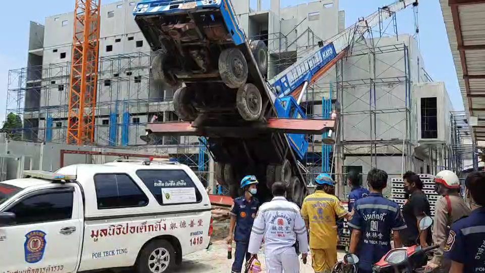 เมื่อเจ้าหน้าที่ไปถึงพบที่เกิดเหตุเป็นลักษณะสถานที่ก่อสร้างล้อมด้วยแผ่นสังกะสี เนื้อที่ 1 ไร่ ซึ่งมีความสูงทั้งหมด 8 ชั้น เป็นโครงการอาคารที่พักอาศัยพร้อมส่วนประกอบ จำนวน 1 หลัง 68 ห้อง มีบริษัทเอกชนแห่งหนึ่ง เป็นเจ้าของโครงการ จุดเกิดเหตุภายในเป็นบริเวณชั้นล่างสุดข้างกำแพงด้านหลังพบผู้เสียชีวิตเป็นชาย 1 ราย ทราบชื่อต่อมาชื่อนาย อ่าว ยิม อายุ 43 ปี เป็นชาวพม่าแล้วเป็นคนงานของไซด์งานก่อสร้างแห่งนี้ ลักษณะการแต่งกายสวมใส่เสื้อแขนยาวสีขาวคาดเขียว กางเกงขายาวสีดำ อยู่ในลักษณะนอนตะแคงข้างซ้ายอยู่กับพื้น ที่บริเวณใบหน้ามีบาดแผลเปิดขนาดใหญ่จนแทบจะจำใบหน้าไม่ได้เลยเพราะส่วนของชิ้นเนื้อส่วนใหญ่รวมทั้งดวงตามีร่องรอยของการกระแทกจนยุบและหลุดออกจนเข้าไปถึงกระโหลกศรีษะด้านในเป็นรูกว้างประมาณ 5 นิ้ว แผลที่บริเวณแก้มขวายาว 4 นิ้ว เป็นที่สยดสยองของผู้ที่พบเห็น และคาดว่าน่าจะเป็นสาเหตุของการเสียชีวิตในทันที แล้วจากการตรวจสอบภายในที่เกิดเหตุยังพบแผ่นปูนขนาดใหญ่มากมีความกว้างขนาด 3 เมตร ยาว 3 เมตร ความหนาของแผ่นปูนประมาณ 7 นิ้ว ส่วนน้ำหนักโดยรวมน่าจะประมาณ 500 โล แล้วภายในที่เกิดเหตุใกล้เคียงกับจุดพบศพ ยังพบกับกองเหล็กนั่งร้านเป็นจำนวนมากหล่นกระจัดกระจายไปทั่วบริเวณ อาจจะเป็นเพราะแผ่นปูนดังกล่าวตกลงมาแล้วทำให้นั่งร้านเกิดพังทะลายลงมาด้วย ส่วนเบื้องต้นยังพบกับรถเครนขนาดใหญ่ สีน้ำเงินอยู่ในลักษณะหน้าทิ่มล้อหลังยกลอยขึ้นเหนือพื้นดินและบริเวณส่วนปลายของเครนอยู่บนอาคารดังกล่าว คาดว่าน่าจะเป็นต้นเหตุของเหตุการณ์ที่เกิดขึ้นทั้งหมด