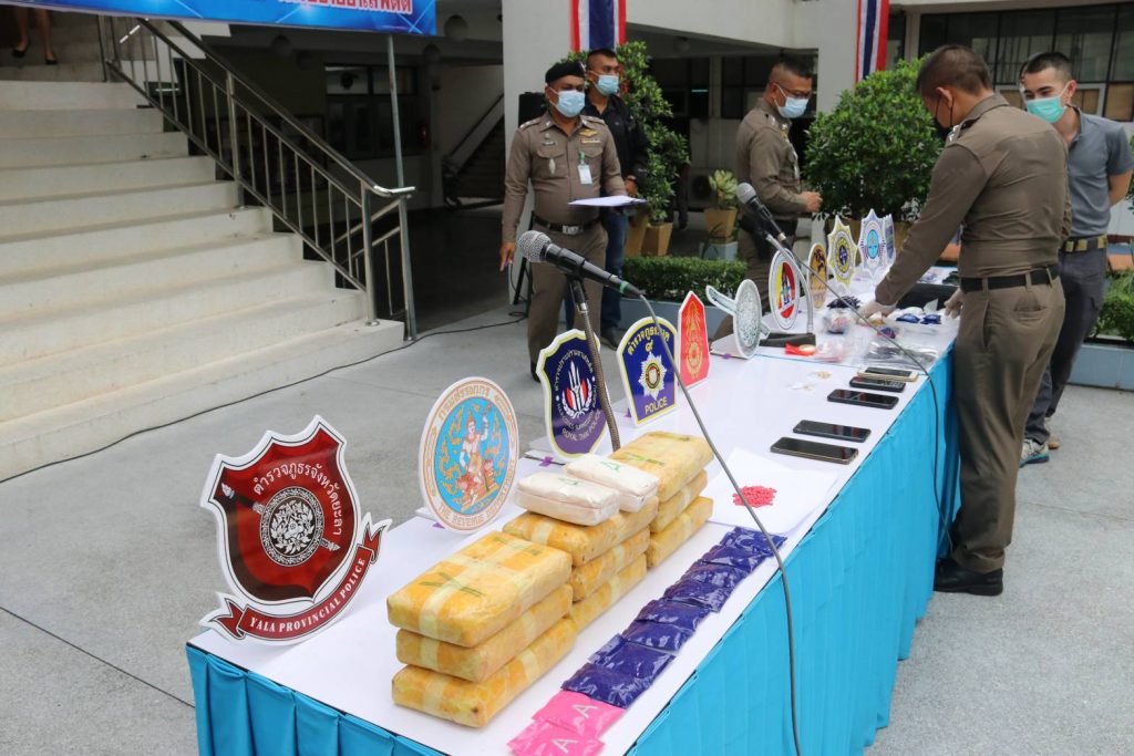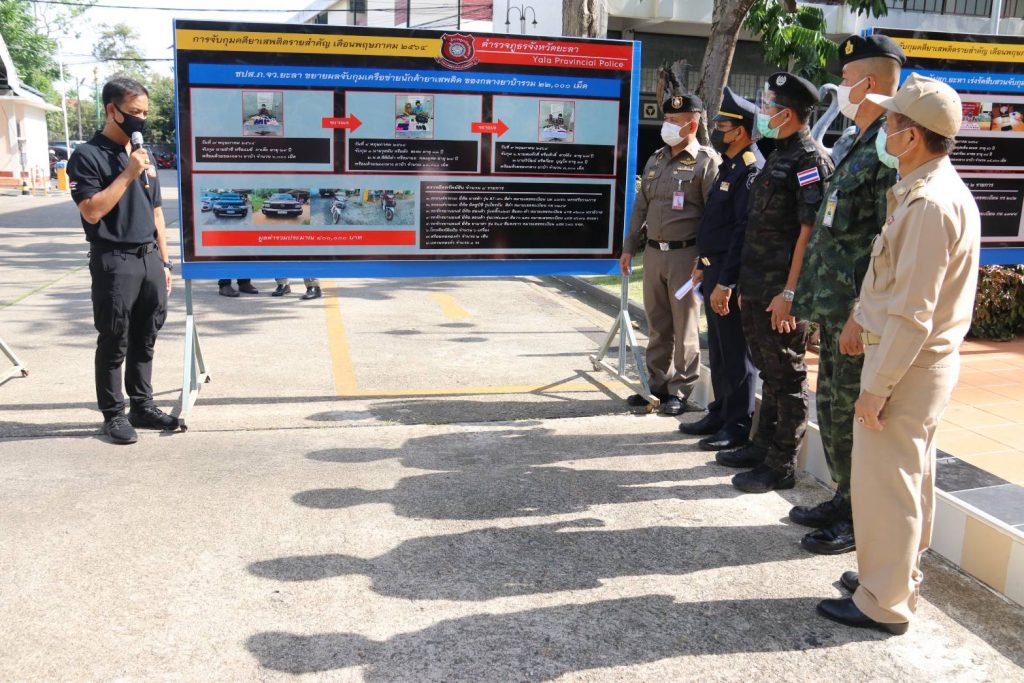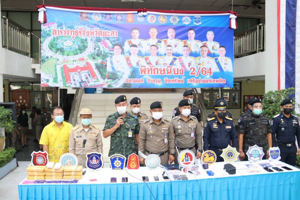 วันนี้ 25 พ.ค.64 ที่ตำรวจภูธรจังหวัดยะลา อ.เมือง จ.ยะลา พล.ต.ต.ดุษฎี ชูสังกิจ รอง ผบช.ภ.9 พร้อมด้วย พล.ต.ต.ทินกร รังมาตย์ ผู้บังคับการตำรวจภูธรจังหวัดยะลาและหน่วยงานที่เกี่ยวข้อง ร่วมกันแถลงข่าวถึงการจับกุมเครือข่ายยาเสพติดรายสำคัญจำนวน 2 เครือข่ายในพื้นที่ โดยเป็นพื้นที่ อ.ยะหา และ อ.กาบัง เชื่อมโยงกับพื้นที่อำเภอบันนังสตา และการสั่งซื้อยาเสพติดผ่านทางเครือข่ายออนไลน์อีก 2 คดี