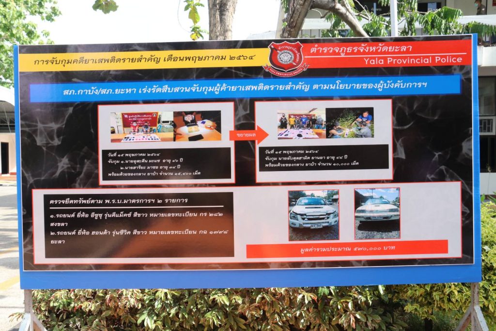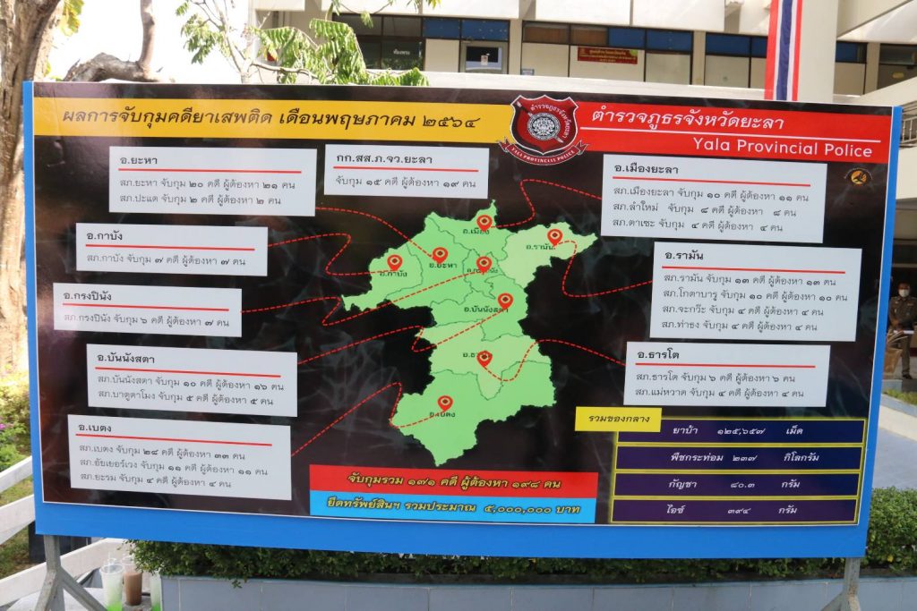 พล.ต.ต.ทินกร รังมาตย์ ผู้บังคับการตำรวจภูธรจังหวัดยะลา กล่าวว่า จากการลงพื้นที่เพื่อสัมผัสรับฟังปัญหาชุมชนจากผู้นำชุมชน ผู้นำศาสนาและประชาชนในพื้นที่ได้รับทราบข้อมูลว่ายังมีการแพร่ระบาดของยาเสพติดในชุมชนโดยเฉพาะพื้นที่ อ.เมืองยะลา อ.ยะหา และอ.กาบัง ซึ่งเป็นเขตพื้นที่ติดต่อกับจังหวัดสงขลาที่สร้างความเดือดร้อนให้กับประชาชน จึงได้สั่งการให้ พ.ต.อ.สุทธิเวท บุญยรัตกลิน รอง ผบก.ภ.จว.ยะลา/หัวหน้าชุดปราบปรามและขยายผลยาเสพติด ภ.จว.ยะลา บูรณาการร่วมกำลังเจ้าหน้าที่ตำรวจ ทหาร และฝ่ายปกครองดำเนินการกวาดล้างยาเสพติดทั้งรายใหญ่ รายย่อย รวมถึงผู้เสพยาเสพติดในระดับหมู่บ้าน และกำชับด่านทุกด่านให้ตรวจสอบบุคคลและรถโดยละเอียดเพื่อป้องกันการขนย้ายยาเสพติดตั้งแต่วันที่ 5 พ.ค. 2564 – 24 พ.ค. 2564 ผลการระดมกวาดล้างสามารถจับกุมได้ 171 คดี , ผู้ต้องหา 198 ราย , ยึดของกลางยาบ้า 125,657 เม็ด , ยาไอซ์ 394 กรัม , กระท่อม 237 กิโลกรัม , กัญชา 80.3 กรัม และยึดทรัพย์สิน ประมาณ 5,000,000 บาท
