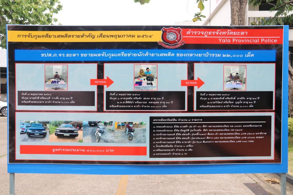 ผบก.ภ.จว.ยะลา เผย เจ้าหน้าที่จับกุมเครือข่ายยาเสพติดรายสำคัญจำนวน 2 เครือข่ายได้ในพื้นที่ อ.ยะหา และ อ.กาบัง สามารถยึดทรัพย์สินได้ประมาณ 5,000,000 บาท