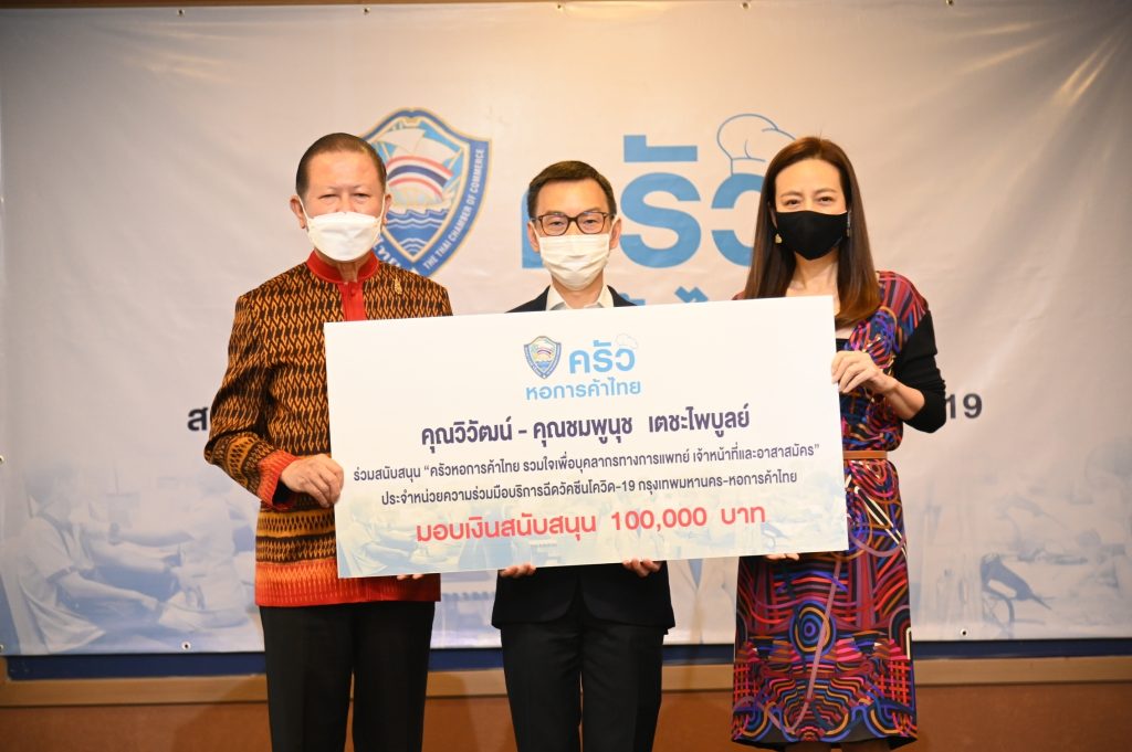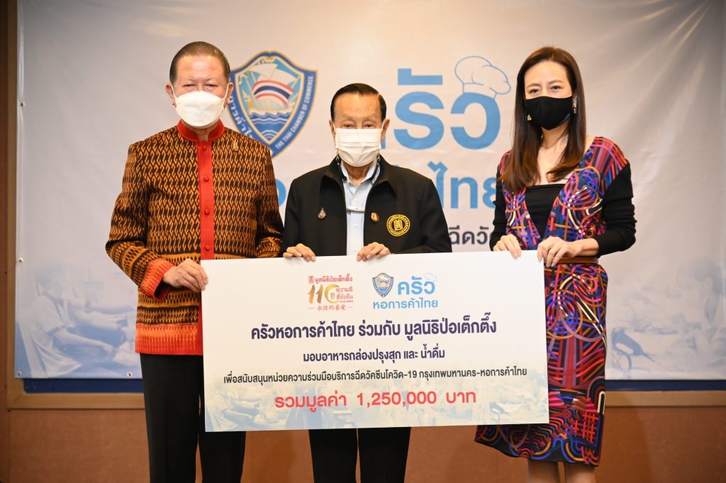 วานนี้ (วันที่ 4 มิถุนายน 64 เวลา 11.00 น.) มูลนิธิป่อเต็กตึ๊ง นำโดย นายวิเชียร เตชะไพบูลย์ ประธานกรรมการ พร้อมด้วย คุณชูเดช เตชะไพบูลย์ ผู้ช่วยกรรมการมูลนิธิฯ มอบอาหารกล่องปรุงสุก และ น้ำดื่ม เพื่อสนับสนุน ” ครัวหอการค้าไทย ” และหน่วยความร่วมมือบริการฉีดวัคซีนโควิด-19 กรุงเทพมหานคร – หอการค้าไทย” รวมมูลค่า 1,250,000 บาท (หนึ่งล้านสองแสนห้าหมื่นบาทถ้วน) พร้อมกันนี้ นายวิวัฒน์-นางชมพูนุช เตชะไพบูลย์ ร่วมมอบเงินสนับสนุน จำนวน 100,000 บาท (หนึ่งแสนบาทถ้วน) โดยมี นายสนั่น อังอุบลกุล ประธานกรรมการหอการค้าไทย และสภาหอการค้าแห่งประเทศไทย เป็นผู้รับมอบ ณ ห้อง Activity Hall อาคารบรรเจิด ชลวิจารณ์ สภาหอการค้าแห่งประเทศไทย