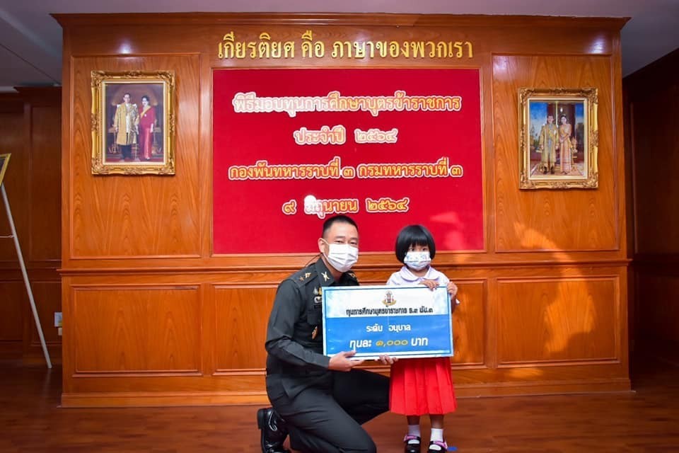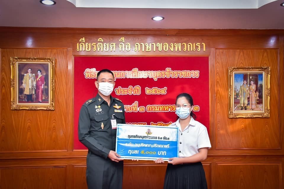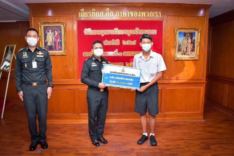 เมื่อวันที่ 9 มิถุนายน 2564 ที่ค่ายพระยอดเมืองขวาง ตำบลกุรุคุ อำเภอเมือง จังหวัดนครพนม ผู้สื่อข่าวรายงานว่า พันโท ศรณณัฐ นวลมณี ผู้บังคับกองพันทหารราบที่ 3 กรมทหารราบที่ 3 (ผบ.ร.3 พัน.3)พร้อมด้วย คณะนายทหาร จัดพิธีมอบทุนการศึกษาให้กับบุตรหลานของกำลังพล หน่วย ร.3 พัน.3 ตามแนวนโยบายของกองทัพบก โดยมีวัตถุประสงค์ เพื่อส่งเสริมการศึกษาของบุตรข้าราชการของหน่วย อันจะก่อให้เกิดผลดีในการพัฒนาประสิทธิภาพบุตรของกำลังพล ให้บุตรหลานกำลังพลของหน่วยมีความประพฤติดี อยู่ในระเบียบวินัยขยันหมั่นเพียรใฝ่เรียน ใฝ่ศึกษา และเป็นบุคลากรที่มีประสิทธิภาพของประเทศชาตินอกจากนั้นยังเป็นการแบ่งเบาภาระค่าใช้จ่ายด้านการศึกษาของบุตร และเป็นขวัญกำลังใจแก่กำลังพลและครอบครัว โดยใช้รูปแบบการมอบทุนแบบออนไลน์ เพื่อป้องกันการแพร่ระบาดของเชื้อไวรัสโควิด -19 ในโอกาสนี้ ผบ.ร.3 พัน.3 ได้กล่าวให้โอวาท ทางออนไลน์ผ่านระบบ Zoom กองทัพบกได้มีนโยบายในการมอบทุนการศึกษาแก่บุตรข้าราชการและลูกจ้างประจำของกองทัพบก โดยเล็งเห็นว่าการส่งเสริมการศึกษาของบุตรข้าราชการ เป็นการพัฒนากองทัพบกอีกทางหนึ่ง และเป็นสิ่งที่จะต้องดำเนินการ เพราะถือว่าการศึกษาเป็นพื้นฐานของการพัฒนาทรัพยากรมนุษย์ ด้วยเหตุผลดังกล่าว กองทัพบกจึงได้มอบแนวนโยบายให้หน่วยขึ้นตรงของกองทัพบก ได้พิจารณา สนับสนุนส่งเสริมบุตรข้าราชการในทุกระดับชั้นยศ โดยเฉพาะข้าราชการชั้นผู้น้อยที่มีความประพฤติดี มีบุตรที่ขยันหมั่นเพียร ใฝ่เรียน ไฝ่ศึกษา เพื่อให้เป็นบุคลากรที่มีความรู้ความสามารถ และมีประสิทธิภาพ ตลอดจนสามารถสอบเข้าศึกษาในสถาบันการศึกษาต่างๆ ตามที่ตนเองถนัด