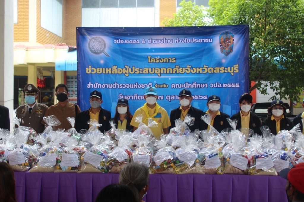 พล.ต.ท.สมพงษ์ กล่าวว่า คณะนักศึกษาวิทยาลัยป้องกันราชอาณาจักรรุ่นที่ 2555 (วปอ.2555) และ สำนักงานตำรวจแห่งชาติ โดย พล.ต.อ.สุวัฒน์ แจ้งยอดสุข ผู้บัญชาการตำรวจแห่งชาติ ในฐานะประธานคณะนักศึกษาวิทยาลัยป้องกันราชอาณาจักรรุ่นที่ 2555 (วปอ.2555) ได้จัดโครงการช่วยเหลือผู้ประสบอุทกภัยจากสถานการณ์น้ำท่วม เนื่องจากมีความห่วงใยพี่น้องประชาชนที่ต้องประสบกับอุทกภัย อีกทั้ง ในปัจจุบันยังอยู่ในช่วงการแพร่ระบาดของเชื้อโควิด-19 อีกด้วย จึงได้ร่วมกันนำสิ่งของเครื่องอุปโภคบริโภคมามอบให้พี่น้องประชาชนผู้ประสบภัยในพื้นที่ประสบภัย จังหวัดสระบุรี และ จังหวัดสิงห์บุรี โดยมีผู้แทนชุมชนเป็นผู้รับมอบ และนำไปแจกจ่ายให้กับประชาชนที่ประสบภัย ทั้งนี้ เพื่อเป็นการรักษาระยะห่างตามมาตรการการป้องกันการแพร่ระบาดของเชื้อโควิด-19 และเพื่อเป็นขวัญและกำลังใจกับประชาชน ให้สามารถต่อสู้กับวิกฤติอุทกภัยครั้งนี้ไปด้วยกัน ซึ่งในส่วนของสำนักงานตำรวจแห่งชาติ ได้มีการมอบนโยบายการรักษาความปลอดภัยในชีวิตและทรัพย์สินของประชาชน กำชับให้เจ้าหน้าที่ในสังกัด จัดเวรยาม ตระเวนออกตรวจตามวงรอบ เพื่อเป็นการป้องปรามมิจฉาชีพที่อาจฉวยโอกาสก่อเหตุอาชญากรรม ซ้ำเติมผู้ประสบภัย อีกทั้งได้สั่งการไปยังผู้บังคับบัญชาทุกหน่วย ตรวจสอบอาคารสถานที่ของทางราชการที่รับผิดชอบ เร่งให้ความช่วยเหลือผู้ใต้บังคับบัญชาที่ได้รับผลกระทบจากภาวะ “น้ำท่วม” พร้อมทั้งให้เฝ้าติดตามและรายงานสถานการณ์ในพื้นที่รับผิดชอบ เพื่อเป็นการวางแผนช่วยเหลือและเยียวยาปัญหาหลังจากสถานการณ์คลี่คลายต่อไป