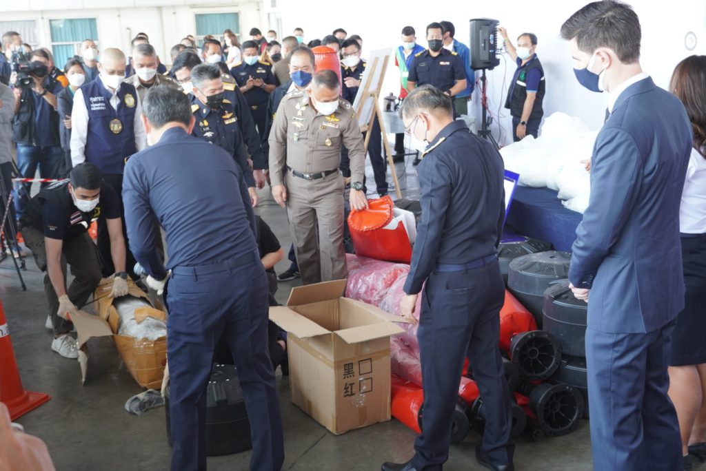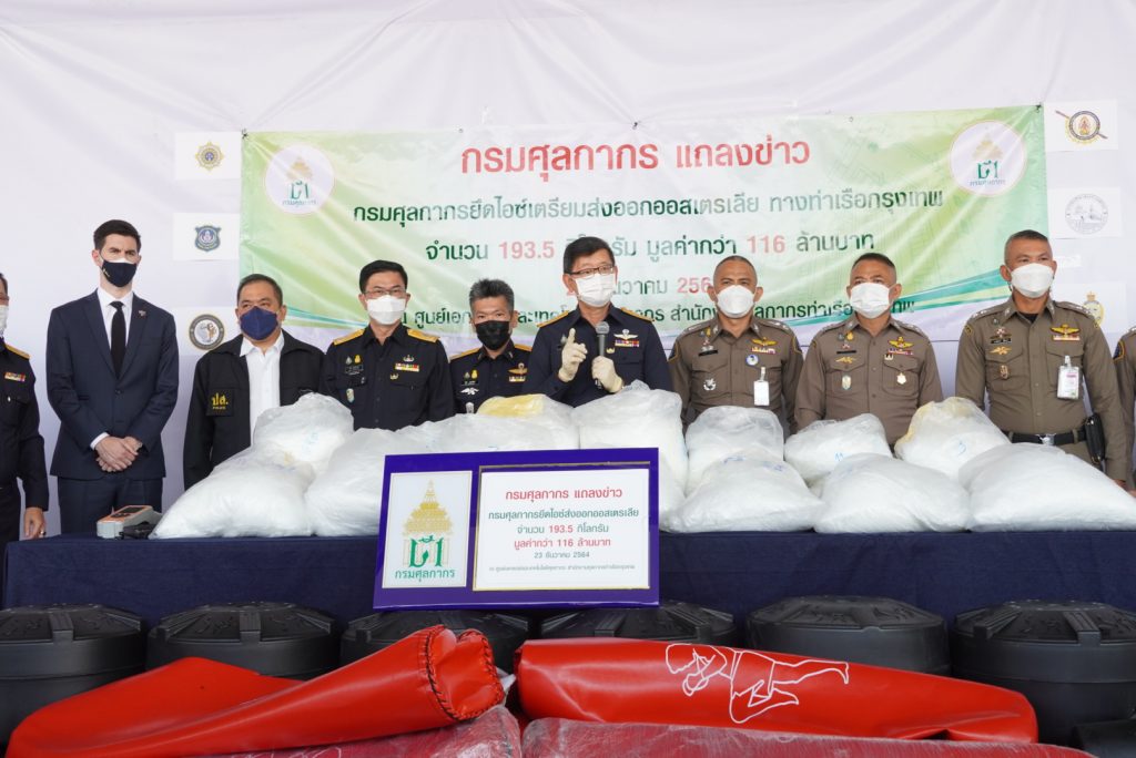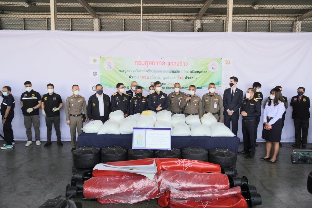 ที่ปรึกษาสำนักงานพิทักษ์เขตแดนออสเตรเลีย (Australian Border Force – ABF) ประจำสถานเอกอัครราชทูตออสเตรเลียประจำประเทศไทย ร่วมกันแถลงข่าวตรวจยึดยาเสพติดให้โทษประเภท 1 (ไอซ์) น้ำหนักรวมสิ่งห่อหุ้มประมาณ 193.5 กิโลกรัม มูลค่าประมาณ 116 ล้านบาท ณ