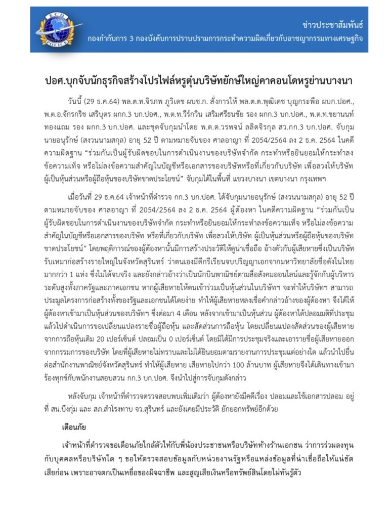 เมื่อวันที่ 29 ธ.ค.64 เจ้าหน้าที่ตำรวจ กก.3 บก.ปอศ. ได้จับกุมนายอนุรักษ์ (สงวนนามสกุล) อายุ 52 ปี ตามหมายจับของ ศาลอาญา ที่ 2054/2564 ลง 2 ธ.ค. 2564 ผู้ต้องหา ในคดีความผิดฐาน “ร่วมกันเป็นผู้รับผิดชอบในการดำเนินงานของบริษัทจำกัด กระทำหรือยินยอมให้กระทำลงข้อความเท็จ หรือไม่ลงข้อความสำคัญในบัญชีหรือเอกสารของบริษัท หรือที่เกี่ยวกับบริษัท เพื่อลวงให้บริษัท ผู้เป็นหุ้นส่วนหรือผู้ถือหุ้นของบริษัท ขาดประโยชน์” โดยพฤติการณ์ของผู้ต้องหานั้นมีการสร้างประวัติให้ดูน่าเชื่อถือ อ้างตัวกับผู้เสียหายซึ่งเป็นบริษัทรับเหมาก่อสร้างรายใหญ่ในจังหวัดสุรินทร์ ว่าตนเองมีดีกรีเรียนจบปริญญาเอกจากมหาวิทยาลัยชื่อดังในไทยมากกว่า 1 แห่ง ซึ่งไม่ได้จบจริง และยังกล่าวอ้างว่าเป็นนักบินพาณิชย์ตามสื่อสังคมออนไลน์และรู้จักกับผู้บริหารระดับสูงทั้งภาครัฐและภาคเอกชน หากผู้เสียหายให้ตนเข้าร่วมเป็นหุ้นส่วนในบริษัทฯ จะทำให้บริษัทฯ สามารถประมูลโครงการก่อสร้างทั้งของรัฐและเอกชนได้โดยง่าย ทำให้ผู้เสียหายหลงเชื่อคำกล่าวอ้างของผู้ต้องหา จึงได้ให้ผู้ต้องหาเข้ามาเป็นหุ้นส่วนของบริษัทฯ ซึ่งต่อมา 4 เดือน หลังจากเข้ามาเป็นหุ้นส่วน ผู้ต้องหาได้ปลอมมติที่ประชุมแล้วไปดำเนินการขอเปลี่ยนแปลงรายชื่อผู้ถือหุ้น และสัดส่วนการถือหุ้น โดยเปลี่ยนแปลงสัดส่วนของผู้เสียหาย จากการถือหุ้นเดิม 20 เปอร์เซ็นต์ ปลอมเป็น 0 เปอร์เซ็นต์ โดยมิได้มีการประชุมจริงและเอารายชื่อผู้เสียหายออกจากกรรมการของบริษัท โดยที่ผู้เสียหายไม่ทราบและไม่ได้ยินยอมตามรายงานการประชุมแต่อย่างใด แล้วนำไปยื่นต่อสำนักงานพาณิชย์จังหวัดสุรินทร์ ทำให้ผู้เสียหาย เสียหายไปกว่า 100 ล้านบาท ผู้เสียหายจึงได้เดินทางเข้ามาร้องทุกข์กับพนักงานสอบสวน กก.3 บก.ปอศ. จึงนำไปสู่การจับกุมดังกล่าว