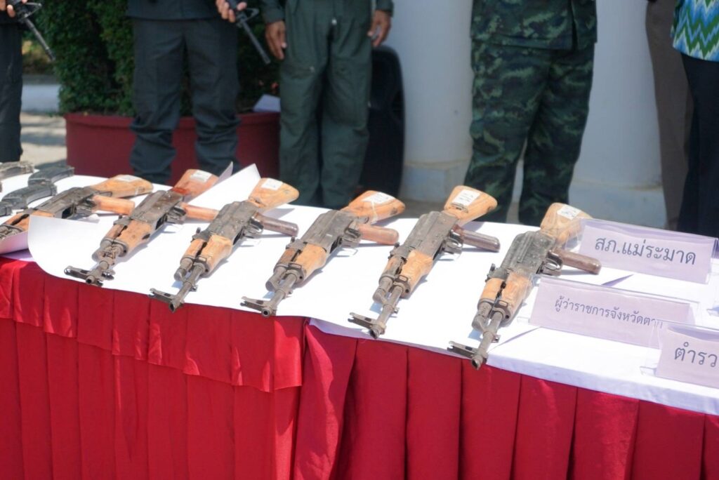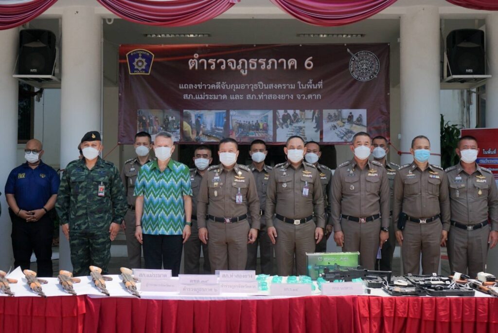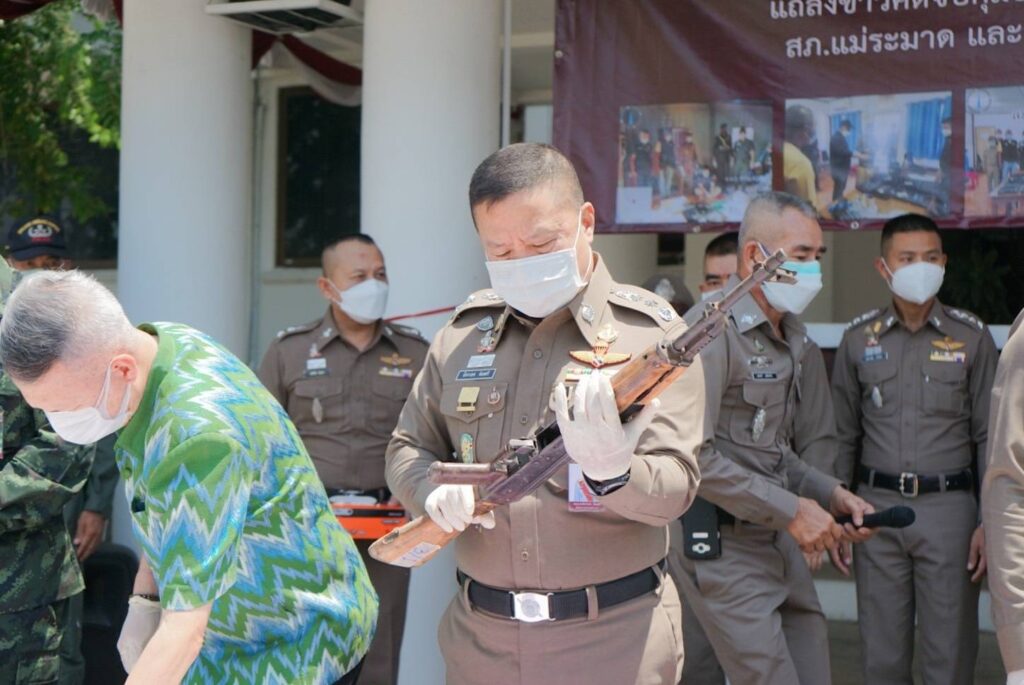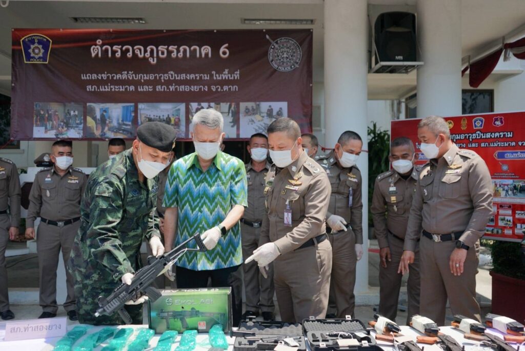 ผู้ว่าราชการจังหวัดตาก,เจ้าหน้าที่ฝ่ายทหารโดย พ.อ.กฤษณ์ กิตยาธิวัฒน์ เสนาธิการกองกำลังนเรศวร และเจ้าหน้าที่ที่เกี่ยวข้อง ร่วมแถลงข่าวการจับกุมขบวนการลักลอบค้าอารุธสงครามผิดกฏหมาย พร้อมยึดของกลางหลายรายการ
