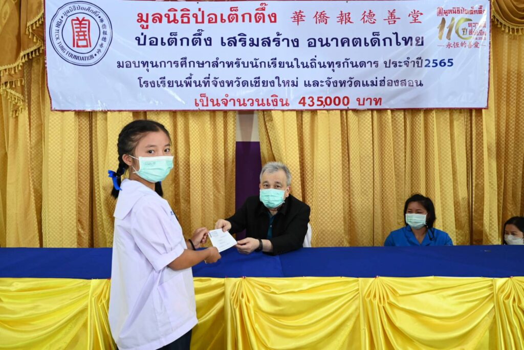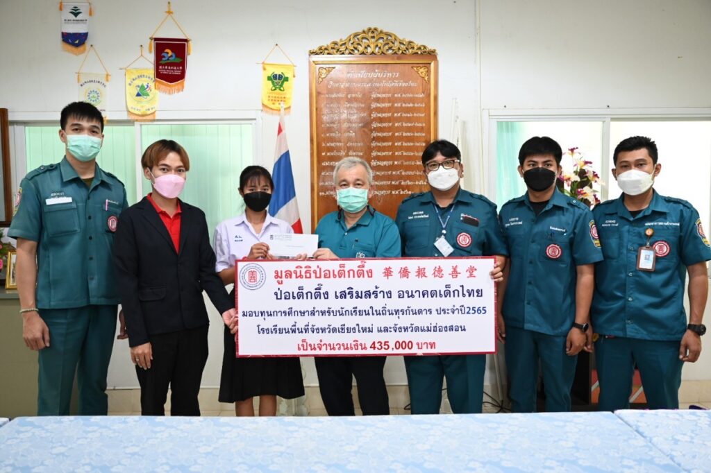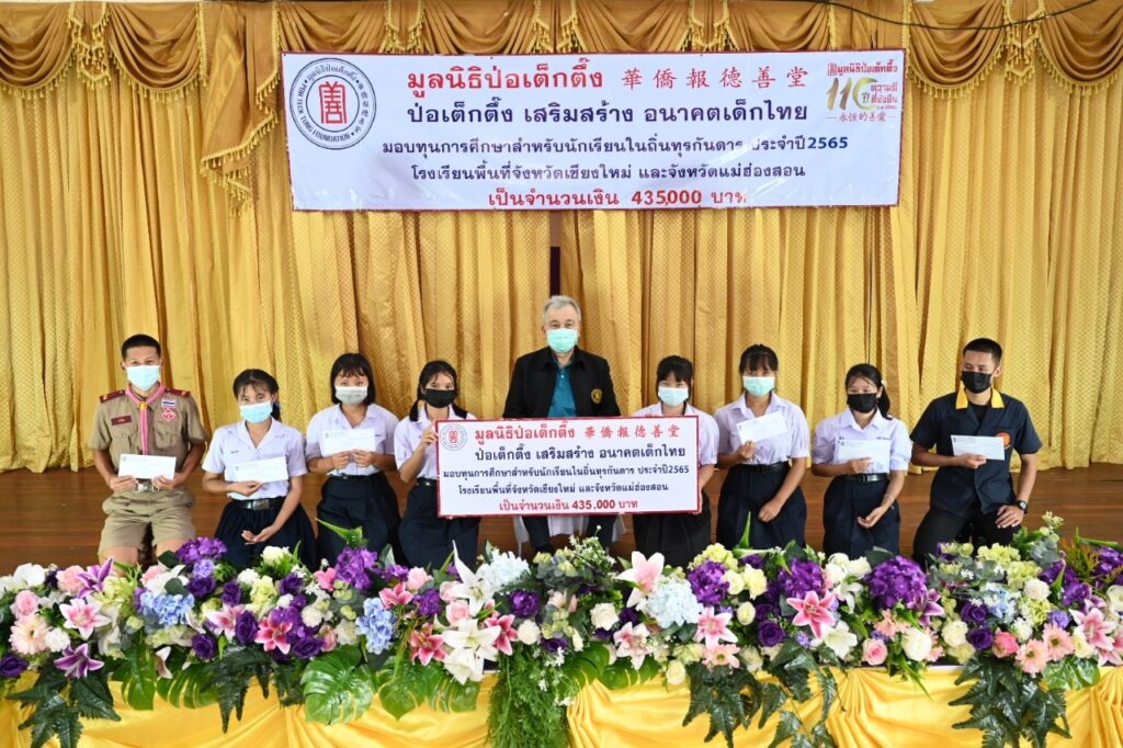 ระหว่างวันที่ 7-10 มิถุนายน 2565 มูลนิธิป่อเต็กตึ๊ง นำโดย นายนิพนธ์ ลีละศิธร กรรมการฯ เป็นประธานในพิธี พร้อมด้วย นายรัชพร ประสงค์ทรัพย์ รักษาการหัวหน้าแผนกสาธารณภัย ฝ่ายสังคมสงเคราะห์ นำทีมลงพื้นที่จังหวัดเชียงใหม่ แม่ฮ่องสอน และตาก มอบทุนการศึกษาแก่เยาวชนในถิ่นทุรกันดาร ครั้งที่ 1 ประจำปี 2565 รวม 14 สถาบัน 111 ทุน รวมมอบทุนการศึกษาเป็นเงินทั้งสิ้น 735,000 บาท พร้อมมอบสิ่งของ และสนับสนุนอาหารกลางวัน(ข้าวกล่อง) น้ำดื่ม ให้แก่ 8 โรงเรียนในพื้นที่จังหวัดแม่ฮ่องสอน รวมทั้งมอบค่าน้ำมันรถแก่ครูที่นำนักเรียนมารับมอบทุนการศึกษา จำนวน 11 โรงเรียน รวมงบประมาณดำเนินการเป็นเงินทั้งสิ้น 876,344 บาท (แปดแสนเจ็ดหมื่นหกพันสามร้อยสี่สิบสี่บาทถ้วน) โดยมีเยาวชน และคณาจารย์จากสถาบันการศึกษาแต่ละแห่ง เป็นตัวแทนรับมอบ