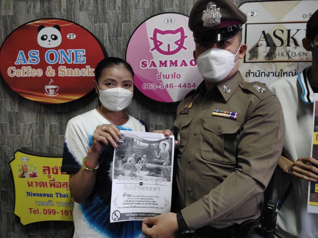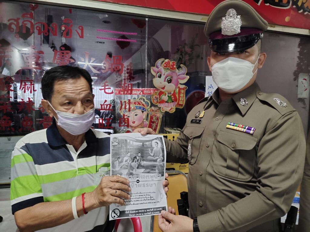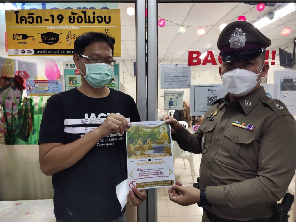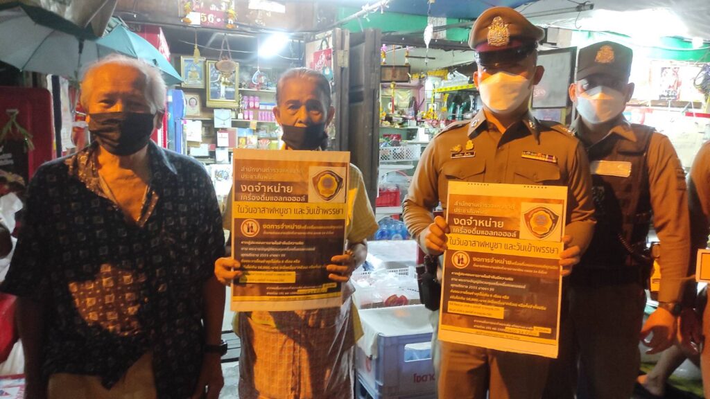 พ.ต.ต.คณาธิป ก้ำแก้ว สวป.สน.จักรวรรดิ พร้อมด้วย จักรวรรดิ 20,สายตรวจ,ทีมงาน ตำรวจชุมชนสัมพันธ์ ประชาสัมพันธ์ห้ามจำหน่ายเครื่องดื่มแอลกอฮอล์ ในวันอาสาฬหบูชาและวันเข้าพรรษา ประจำปี 2565 และขอความร่วมมือมายังประชาชน ผู้ประกอบการร้านค้า ให้งดจำหน่ายและดื่มเครื่องดื่มแอลกอฮอล์ทุกชนิด ทั้งชนิดขายส่งและขายปลีกทั่วราชอาณาจักร ตลอด 24 ชั่วโมง ตั้งแต่เวลาหลังเที่ยงคืน (เวลา 24.00 น.) ของคืนวันที่ 12 ก.ค. 65 จนถึงเวลา 24.00 น. ของคืนวันที่ 14 ก.ค. 65 หากผู้ใดฝ่าฝืน มีความผิดตาม พ.ร.บ.ควบคุมเครื่องดื่มแอลกอฮอล์ พ.ศ. 2551 มาตรา 39 ต้องระวางโทษจำคุกไม่เกิน 6 เดือน หรือปรับไม่เกิน 10,000 บาท หรือ ทั้งจำทั้งปรับ