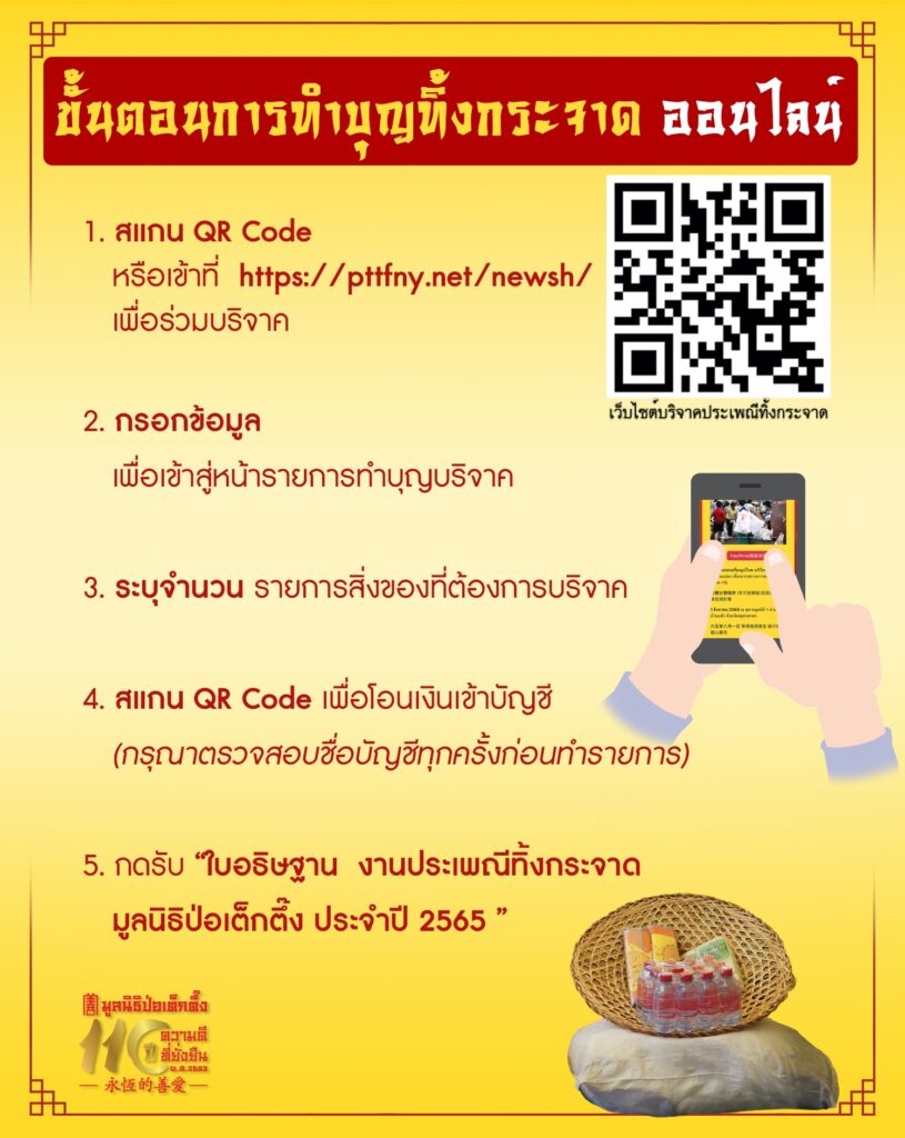 เนื่องจากสถานการณ์การแพร่ระบาดของโควิด-19 ในขณะนี้ เพื่อลดความเสี่ยงและการเพิ่มมาตรการการป้องกันการแพร่ระบาด มูลนิธิป่อเต็กตึ๊ง จึงจัดให้มีช่องทางการร่วมทำบุญทิ้งกระจาดใหม่ ผ่านระบบออนไลน์ https://pttfny.net/newsh/ ในอีกทางหนึ่ง
