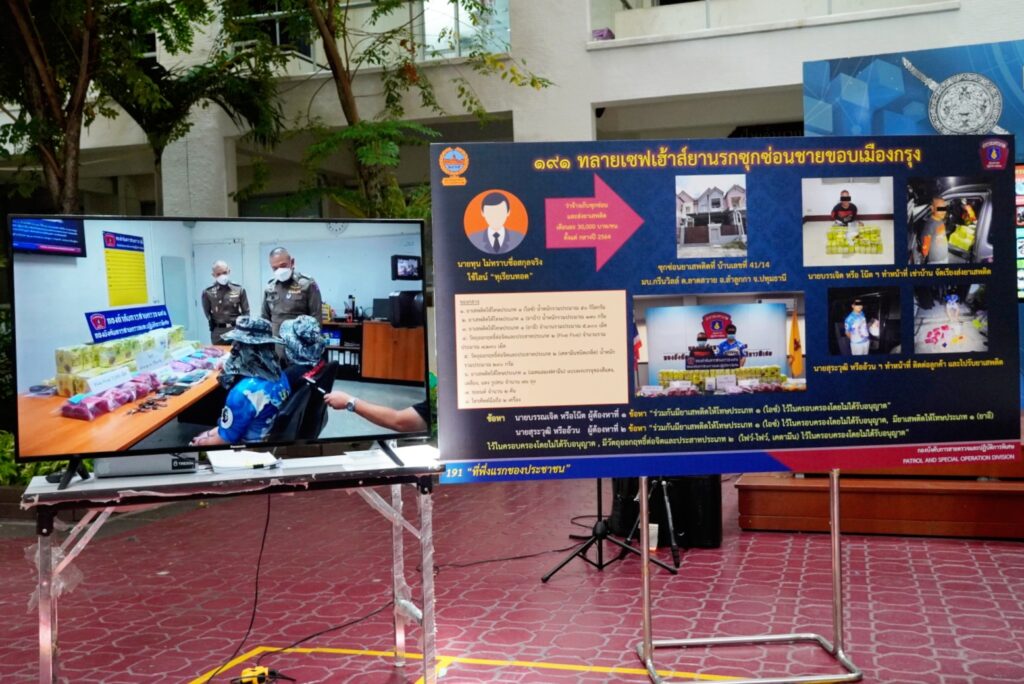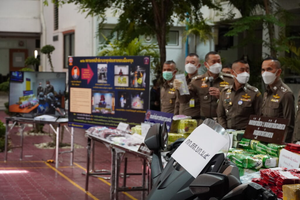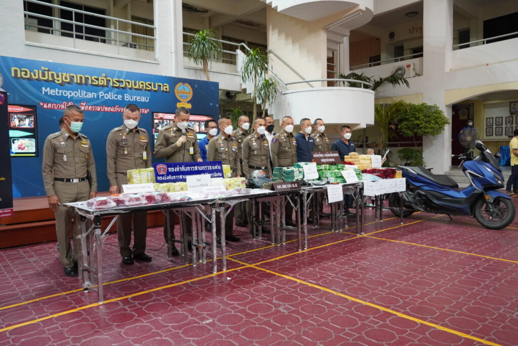 อ.บางกรวย จ.นนทบุรี และบริเวณใกล้เคียง จนกระทั่งเมื่อวันที่ 8 สิงหาคม 2565 เวลาประมาณ 03.30 น.พบรถยนต์ฮอนด้า CRV สีดำ ติดแผ่นป้ายทะเบียน 1 ขฆ-873 กรุงเทพฯ ขับเข้ามาจอดบริเวณลานจอดด้านหน้าห้องพักจินดา อพาร์ตเมนต์ ต.บางขุนกอง อ.บางกรวย จ.นนทบุรี ซึ่งเจ้าหน้าที่เห็นเหตุการณ์โดยตลอด เจ้าหน้าที่ตำรวจจึงเข้าแสดงตัวตรวจค้นจับกุมพบของกลางดังกล่าว จากการสอบถาม นายธนวัฒน์ฯ และนายขจรฯ ให้การรับสารภาพตลอดข้อกล่าวหา โดยนายธนวัฒน์ฯ รับว่าตนเองทำมาแล้วประมาณ 1 ปี ทั้งนี้ตนเองนั้นไม่มีอาชีพที่แน่นอน ส่วนนายขจรฯ รับว่าตนเองทำมาแล้วประมาณ 6 เดือน ก่อนหน้าที่จะมาส่งยาเสพติดทำงานร้านสะดวกซื้อมาก่อน จึงได้จับกุมผู้ต้องหาพร้อมของกลางนำส่งพนักงานสอบสวน บช.ปส.เพื่อดำเนินคดีตามกฎหมายต่อไป