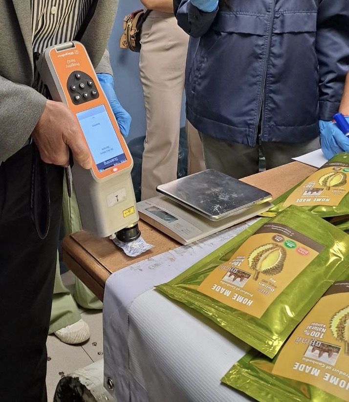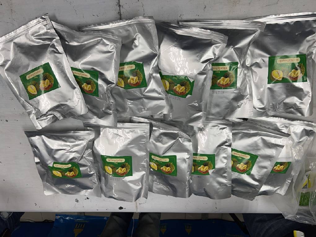 ถุงทุเรียนอบแห้ง ซึ่งเป็นผลิตภัณฑ์ที่ผลิตในประเทศกัมพูชา จำนวน 4 ลัง รวมเฮโรอีนที่ตรวจยึดทั้งหมด