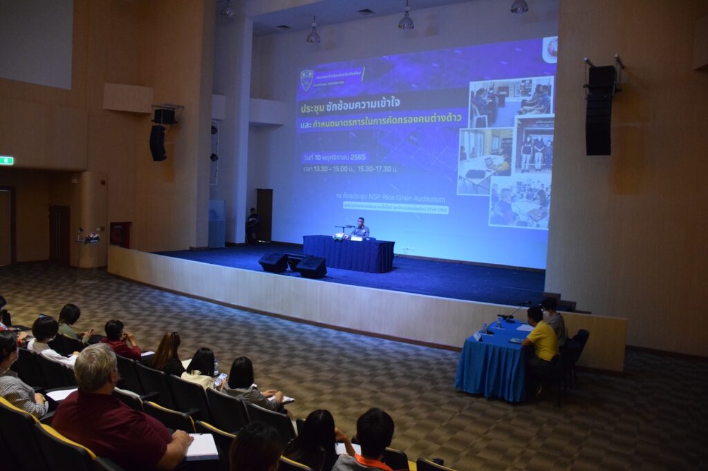 ตม.จว.เชียงใหม่ โดย พ.ต.อ.วีรวัฒน์ นิลวัตร ผกก.ตม.จว.เชียงใหม่ และเจ้าหน้าที่ในสังกัด จึงได้จัดประชุมกับหน่วยงานของรัฐที่เกี่ยวข้อง ได้แก่ สํานักงานพัฒนาสังคมและความมั่นคงของมนุษย์จังหวัด เชียงใหม่ ที่ทําการปกครองจังหวัดเชียงใหม่ สํานักงานศึกษาธิการจังหวัดเชียงใหม่ เจ้าหน้าที่มูลนิธิ สมาคม และเจ้าหน้าที่จากสถานศึกษาของรัฐหรือเอกชน ในหัวข้อ “การประชุมซักซ้อมความเข้าใจ และกําหนด มาตรการในการคัดกรองคนต่างด้าว” จัดขึ้นในวันพฤหัสบดีที่ 10 พ.ย.2565 ณ ห้องประชุม NSP RICE GRAIN AUDITORIUM อุทยานวิทยาศาสตร์และเทคโนโลยี มหาวิทยาลัยเชียงใหม่ (CMU STeP) จว.เชียงใหม่ โดยมี ผู้เข้าร่วมประชุม ดังนี้