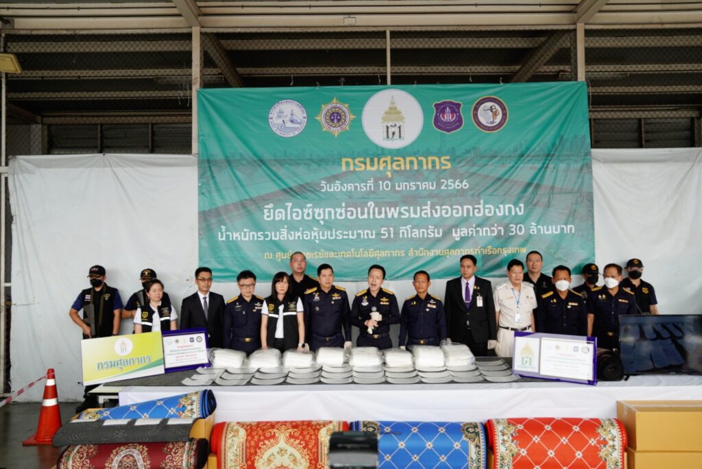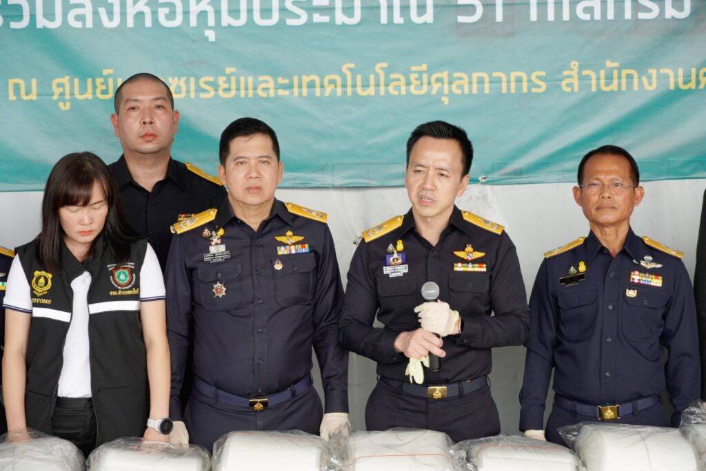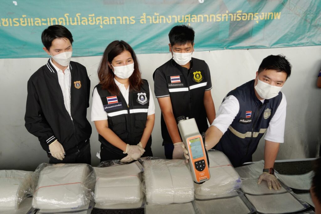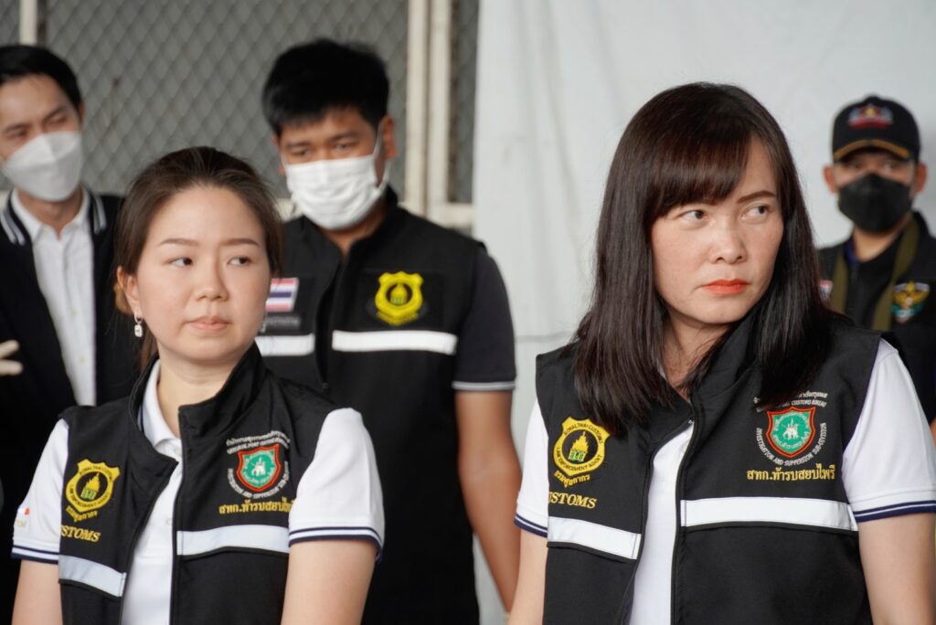 วันนี้ (10 มกราคม 2566) เวลา 14.00 น. นายพันธ์ทอง ลอยกุลนันท์ รองอธิบดีกรมศุลกากร รักษาการในตำแหน่งที่ปรึกษาด้านการพัฒนาและบริหารการจัดเก็บภาษี นายพงศ์เทพ บัวทรัพย์ รองอธิบดีกรมศุลกากรรักษาการในตำแหน่งที่ปรึกษาด้านพัฒนาระบบควบคุมทางศุลกากร นายถวัลย์ รอดจิตต์ ผู้อำนวยการกองสืบสวนและปราบปราม พ.ต.อ.ณรัชต์พล เลิศรัชตะปภัสร์ ผู้อำนวยการสำนักงานศุลกากรท่าเรือกรุงเทพ และหน่วย SITF โดยนายธัญญาวิทย์ พราวพิจักขณากูล ผู้อำนวยการส่วนสืบสวนทางการเงิน สำนักปราบปรามยาเสพติด (ป.ป.ส.) พ.ต.อ.เส้นชัย ฟู่เจริญ ผกก.3 บก.ปส.1 กองบัญชาการตำรวจปราบปรามยาเสพติด (บช.ปส.) และ พ.อ.มารุต