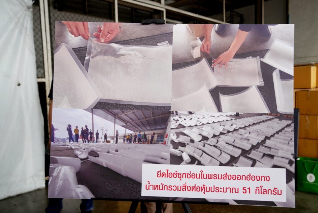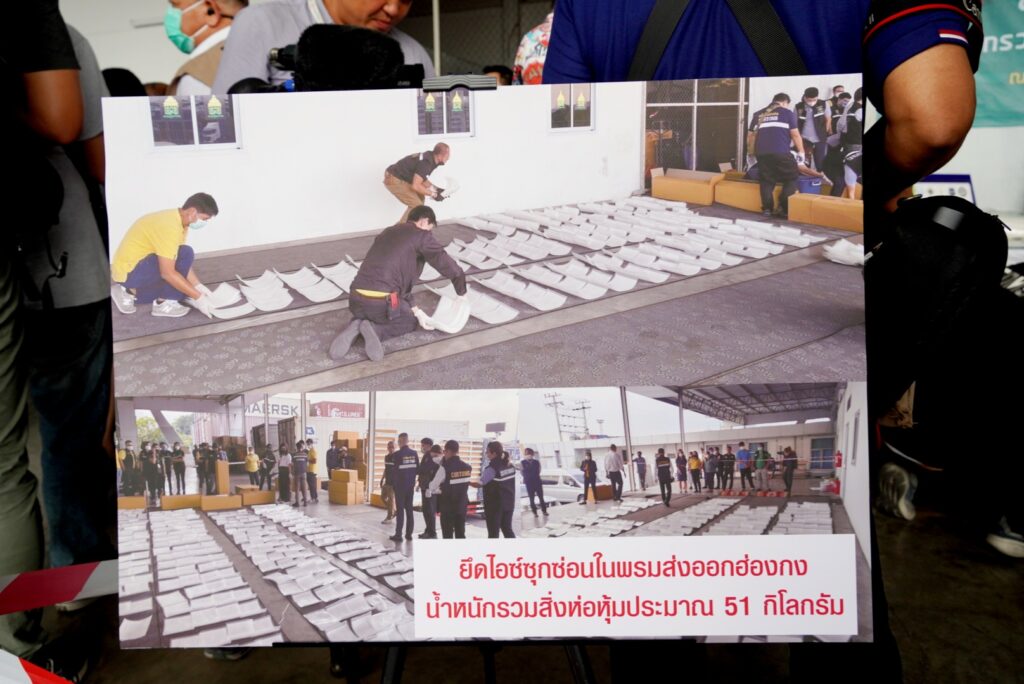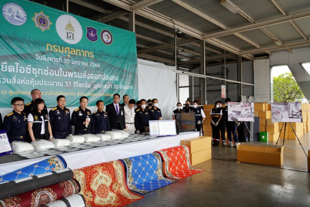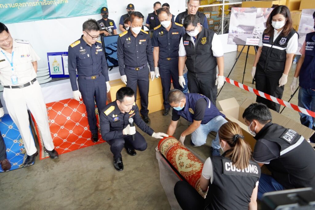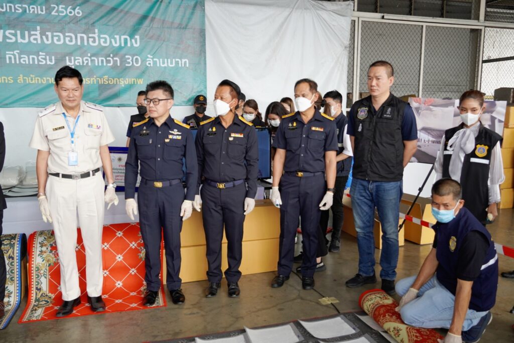 โดยเมื่อวันที่ 9 มกราคม 2566 กองสืบสวนและปราบปราม ร่วมกับ สำนักงานศุลกากรท่าเรือกรุงเทพ กรมศุลกากร และหน่วย SITF ตรวจสอบสินค้าต้องสงสัยที่มีความเสี่ยงสูงในการลักลอบลำเลียงยาเสพติดไปยังต่างประเทศ โดยสำแดงชนิดสินค้าเป็นพรม (THAI PURE COTTON CARPET) ส่งออกทางท่าเรือกรุงเทพ ประเทศไทย ปลายทางฮ่องกง จากผลการวิเคราะห์ภาพเอกซเรย์พบความผิดปกติ จึงได้ดำเนินการตรวจสอบทางกายภาพ
