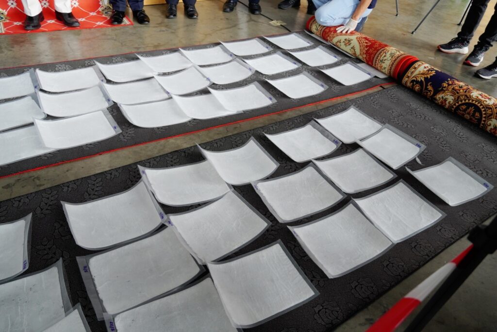 ม้วนอยู่ภายในพรม น้ำหนักรวมสิ่งห่อหุ้มประมาณ 51 กิโลกรัม มูลค่ากว่า 30 ล้านบาท จึงได้ร่วมกับหน่วย SITF