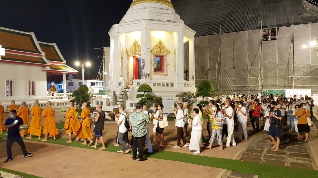 เวลา ๒๐.๐๐ น. เวียนเทียนรอบเจดีย์แปดเหลี่ยม