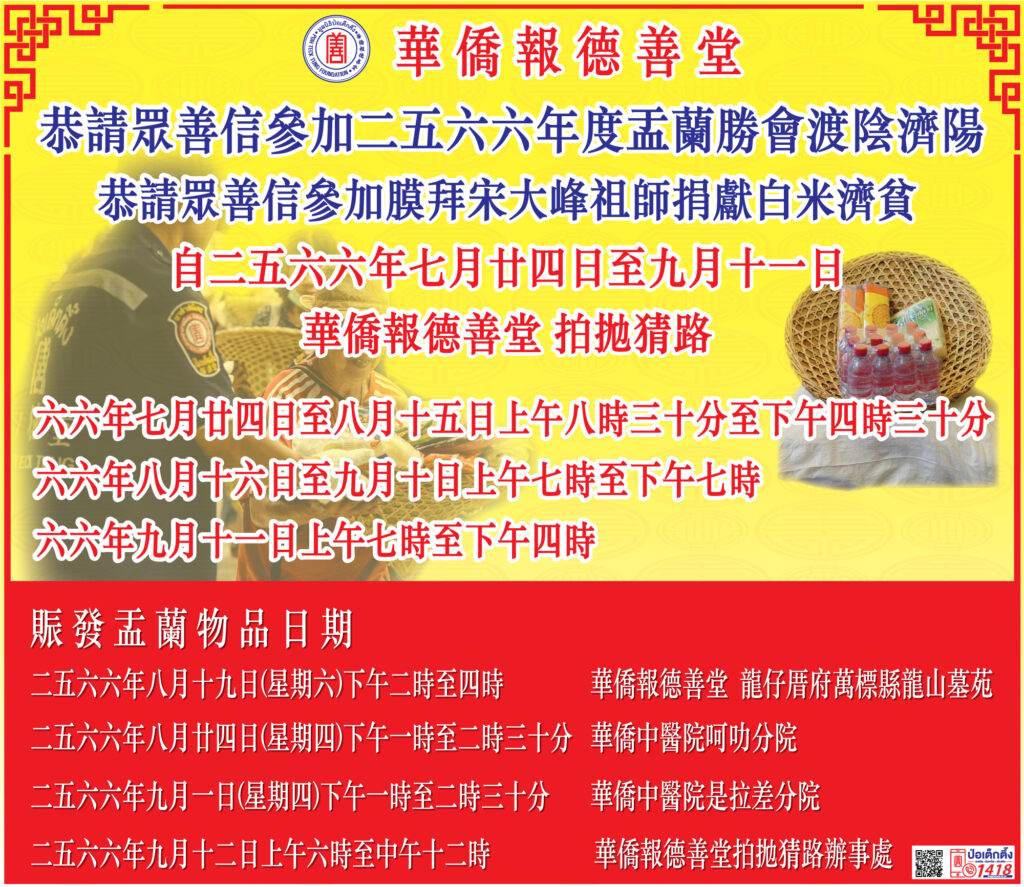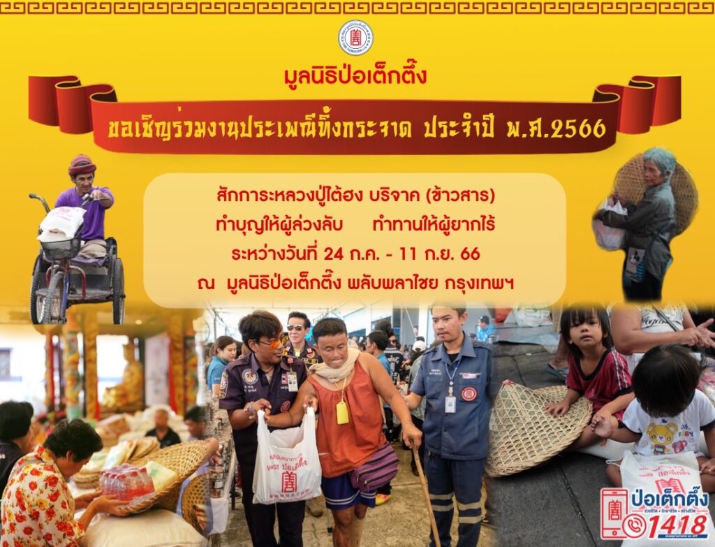 มูลนิธิป่อเต็กตึ๊ง ขอเชิญผู้มีจิตศรัทธาร่วมงานมหาบุญ งานมหากุศลครั้งยิ่งใหญ่ ในประเพณีทิ้งกระจาด ประจำปี 2566 “ทำบุญอุทิศส่วนกุศลให้ผู้ล่วงลับ พร้อมทำทาน” ให้แก่ผู้ยากไร้ ณ มูลนิธิป่อเต็กตึ๊ง พลับพลาไชย กรุงเทพฯ