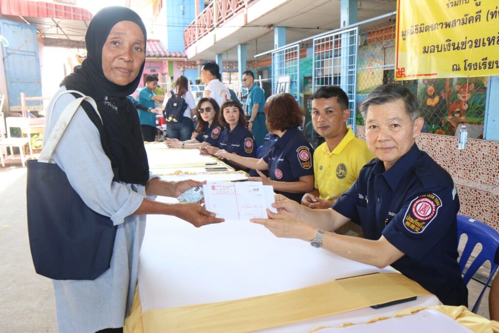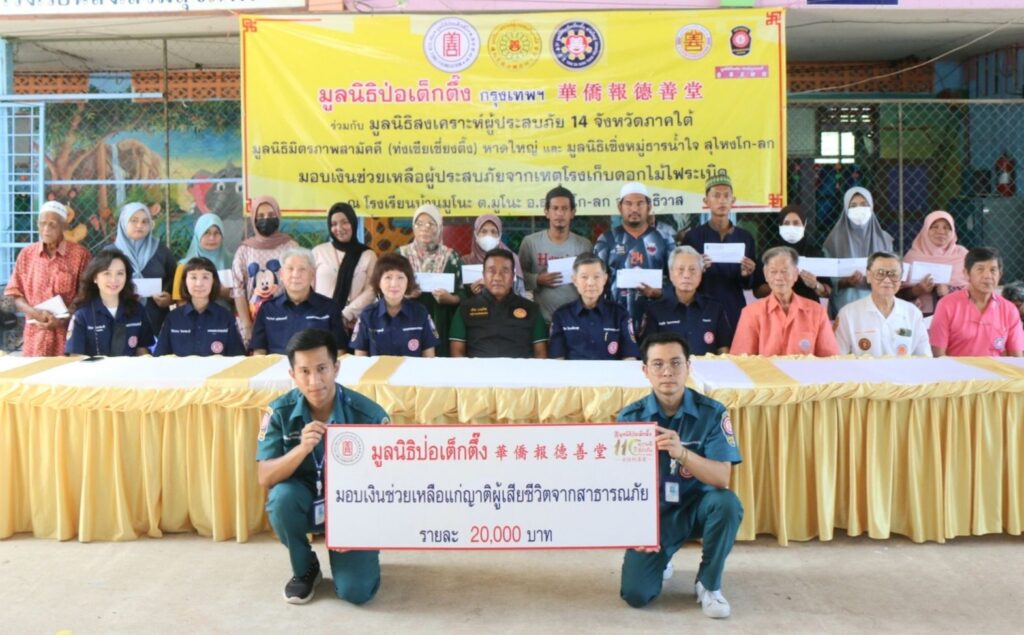 วานนี้ (วันที่ 9 สิงหาคม 2566) มูลนิธิป่อเต็กตึ๊ง นำโดย นายวิชิต ชินวงศ์วรกุล รองประธานกรรมการ พร้อมด้วย นางศิริกุล โอภาสวงศ์ กรรมการและเลขาธิการ นายจารุรัตน์ คุณัตถานนท์ กรรมการและเหรัญญิก นายชาญกิจ วิทยาวรากรณ์ กรรมการ พร้อมด้วยคณะผู้บริหารมูลนิธิฯ นำทีมเจ้าหน้าที่แผนกสาธารณภัย ฝ่ายสังคมสงเคราะห์ และแผนกบัญชี ฝ่ายบัญชีและการเงิน ลงพื้นที่มอบเงินช่วยเหลือแก่ญาติผู้เสียชีวิต จำนวน 11 รายๆ ละ 20,000 บาท มอบเงินช่วยเหลือแก่ผู้บาดเจ็บ จำนวน 13 คนๆ ละ 5,000 บาท และมอบเงินช่วยเหลือให้แก่ผู้ประสบภัย จำนวน 570 ครอบครัว 1,766 คนๆ ละ 3,000 บาท รวมงบประมาณการช่วยเหลือเป็นเงินทั้งสิ้น 5,583,000 บาท (ห้าล้านห้าแสนแปดหมื่นสามพันบาทถ้วน) พร้อมกันนี้ มูลนิธิสงเคราะห์ผู้ประสบภัย 14 จังหวัดภาคใต้ ได้มอบเงินช่วยเหลือแก่ญาติผู้เสียชีวิตรายละ 5,000 บาท มอบเงินช่วยเหลือแก่ผู้บาดเจ็บคนละ 2,000 บาท และมอบเงินช่วยเหลือให้แก่ผู้ประสบภัยคนละ 1,000 บาท รวมเป็นเงินทั้งสิ้น 1,847,000 บาท (หนึ่งล้านแปดแสนสี่หมื่นเจ็ดพันบาทถ้วน) โดยมี นายปรีชา นวลน้อย รองผู้ว่าราชการจังหวัดนราธิวาส เป็นประธานในพิธี พร้อมด้วย มูลนิธิสงเคราะห์ผู้ประสบภัย 14 จังหวัดภาคใต้ เป็นผู้ประสานงานและร่วมให้ความช่วยเหลือ รวมทั้ง อาสาสมัครมูลนิธิป่อเต็กตึ๊ง นำโดย นางศิริวรรณ โอภาสวงศ์ อาสาสมัครกิตติมศักดิ์ และนางศิริพร โอภาสวงศ์ อาสาสมัครกิตติมศักดิ์ คณะมูลนิธิมิตรภาพสามัคคี (ท่งเซียเซี่ยงตึ๊ง) หาดใหญ่ คณะมูลนิธิเซิ่งหมู่ธารน้ำใจ สุไหงโก-ลก มูลนิธิแม่กอเหนี่ยวยะลา และคณะมูลนิธิร่วมบำเพ็ญการกุศลปัตตานี (ท่งเต็กเซี่ยงตึ๊ง) ร่วมในพิธี ณ โรงเรียนบ้านมูโนะ อำเภอสุไหง-โกลก จังหวัดนราธิวาส