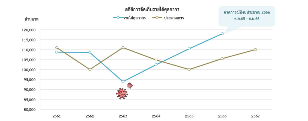 (เดือนตุลาคม พ.ศ. 2565 – 15 กันยายน พ.ศ. 2566) จัดเก็บได้ 114,475 ล้านบาท สูงกว่าประมาณการ 8,975 ล้านบาท (ประมาณการตามเอกสารงบประมาณ 105,500 ล้านบาท) และคาดว่าเมื่อสิ้นสุดปีงบประมาณ 2566 จะจัดเก็บได้ 118,000 ล้านบาท ซึ่งจะสูงกว่าประมาณการฯ 12,500 ล้านบาท หรือสูงกว่ากว่าประมาณการฯ ร้อยละ 11.85 จึงทำให้มียอดการจัดเก็บรายได้ศุลกากรที่สูงที่สุดในรอบ 6 ปี รายละเอียดตามแผนภูมิ