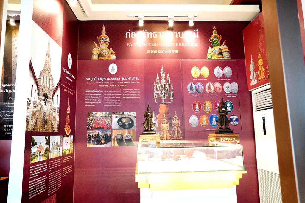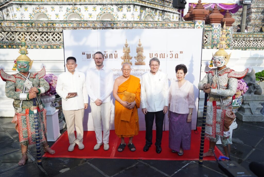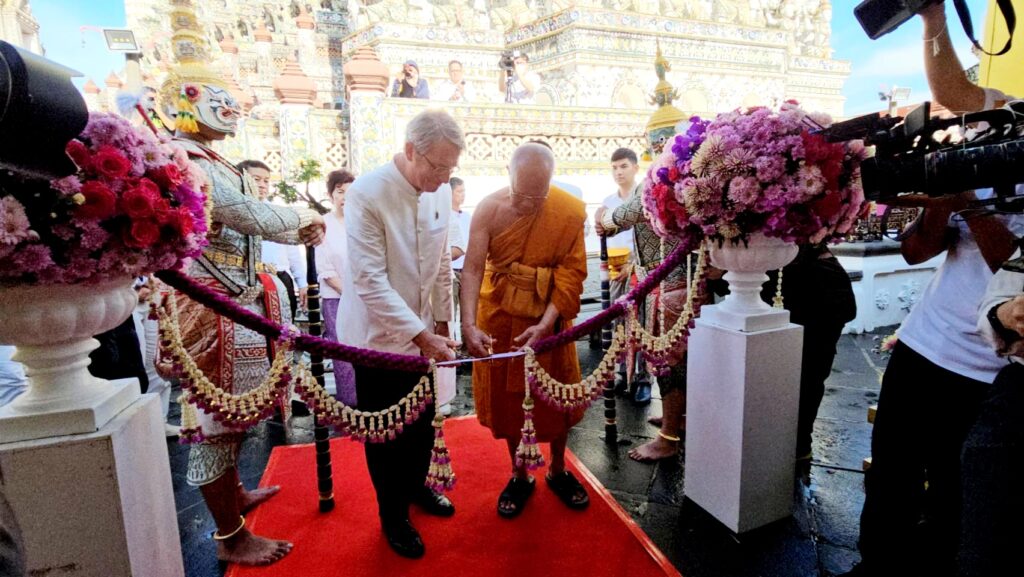พระเดชพระคุณ พระพรหมวัชรเมธี เจ้าอาวาสวัดอรุณราชวราราม ประธานฝ่ายสงฆ์ และ เจ้าหน้าที่บริหาร บริษัท บี.กริม พาวเวอร์ จำกัด (มหาชน) ประธานฝ่ายฆราวาส ร่วมประกอบพิธีตัดริบบิ้นเปิดนิทรรศการฯ โดยมีคณะพระสงฆ์สวดเจริญชัยมงคลคาถา