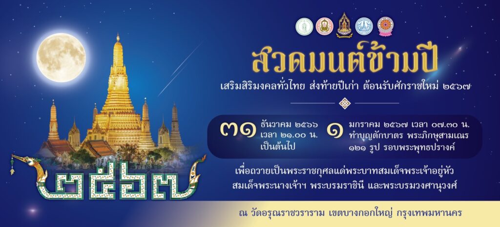 วัดอรุณราชวราราม ราชวรวิหาร ขอเรียนเชิญสาธุชน ปวงชนชาวไทย เข้าร่วมในการประกอบพิธี “สวดมนต์ข้ามปี” เพื่อเสริมความเป็นสิริมงคลให้กับผู้ที่เข้าร่วมในการประกอบพิธีฯ โดยพระเดชพระคุณ พระพรหมวัชรเมธี หลวงพ่อเจ้าอาวาสวัดอรุณราชวราราม ได้เมตตาให้จัดพิธี “สวดมนต์ข้ามปี ส่งท้ายปี ๒๕๖๖ ต้อนรับปี ๒๕๖๗ ในการประกอบพิธีในครั้งนี้ เพื่อถวายเป็นพระราชกุศลแด่พระบาทสมเด็จพระเจ้าอยู่หัว สมเด็จพระนางเจ้าฯ พระบรมราชินี และพระบรมวงศานุวงศ์ ตลอดจนเพื่อเสริมความเป็นสิริมงคล แด่สาธุชนที่เข้าร่วมในการประกอบพิธีฯ