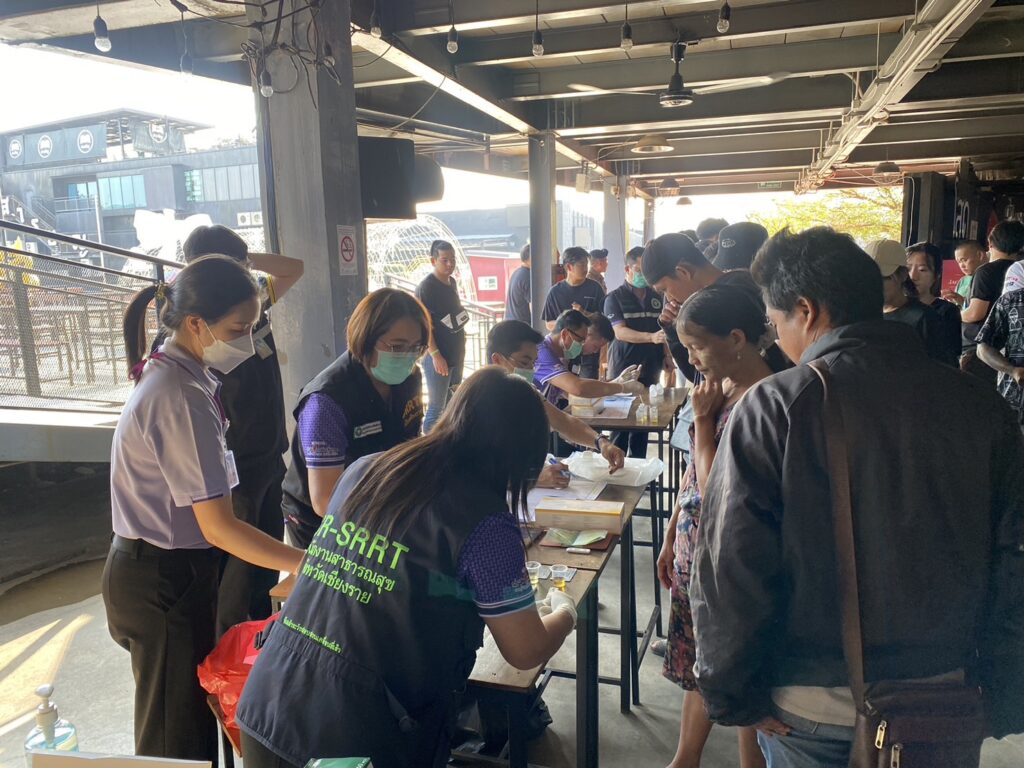 เวลา 15.30 น.วันนี้ 9 ม.ค.2567 พล.ต.ต.มานพ เสนากูล ผบก.ภ.จว.เชียงราย, พ.ต.อ.รัฐพล น้อยช่างคิด รอง ผบก.ภ.จว.เชียงราย มอบหมายให้ พ.ต.อ.โสภณ ม่วงเฟื่อง ผกก.สภ.เมืองเชียงราย, พ.ต.อ.พัสกร ธวัชเชียงกุล ผกก.สส.ภ.จว.เชียงราย, ว่าที่ร้อยตรี บงการ ชัยชาญ สาธารณสุขอำเภอเมืองเชียงราย, พ.ต.ท.ฉันทฤทธิ์ เหล่าไพโรจน์จารี รอง ผกก.ป.สภ.เมืองเชียงราย, พ.ต.ท.พรต เศรษฐกร รอง ผกก.สส.สภ.เมืองเชียงราย, พ.ต.ท.พงทวี เตชะวงศ์ รอง ผกก.สส.ภ.จว.เชียงราย, พ.ต.ท.สถาพร มังคลาด สวป.สภ.เมืองเชียงราย, พ.ต.ท.สมชาย พรหมมินทร์ สว.สส.สภ.เมืองเชียงราย, พ.ต.ท.พันธุ์ระวี วงศ์ชัย สว.กก.สส.ภ.จว.เชียงราย, พ.ต.ต.อิทธิพัทธ์ ศรีวิชัย สวป. (ชส) สภ.เมืองเชียงราย พร้อมชุดปฏิบัติการสายตรวจ, ชุดสืบสวน สภ.เมืองเชียงราย, จนท.กก.สส.ภ.จว.เชียงราย, จนท.สาธารณสุขอำเภอเมืองเชียงรายร่วมกัน ตรวจปัสสาวะหาสารเสพติดจากพนักงานของสถานประกอบการในพื้นที่ ตามโครงการ สถานบริการสีขาว โดยมีสถานบริการให้ความร่วมมือเป็นอย่างดี จำนวน 12 ร้าน มีพนักงานเข้ารับการตรวจประมาณ 250 คน จากสถานประกอบการ โดยมี