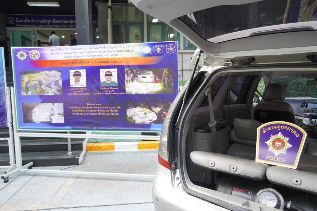 ต่อมา ในวันที่ 19 มกราคม 2567 จากการสืบสวนทราบว่า นายุยุทธนาฯ และนายพิชาญฯ ผู้ต้องหาไช้รถยนต์อเนกประสงค์ สีเทา เป็นยานพาหนะ ได้มารับยาเสพติดในพื้นที่ จว.พระนครศรีอยุธยา เจ้าหน้าที่ชุดจับกุมจึงสะกดรอยติดตามจนถึงบริเวณทางหลวงชนบทหมายเลข 3394 ม.12 ต.ห้วยหมอนทอง อ.กำแพงแสน จ.นครปฐม เจ้าหน้าที่ชุดจับกุม จึงเข้าแสดงตนเข้าตรวจสอบ และสามารถจับกุมตัวผู้ต้องหาได้พร้อมของกลาง ดังนี้