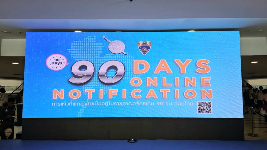 ก่อนถึงวันครบกำหนด สามารถแจ้งได้ทุกที่ ทุกเวลา ผ่านช่องทางออนไลน์ ไม่ว่าจะเป็น โทรศัพท์มือถือ, แท็บเล็ต หรือคอมพิวเตอร์ โดยเข้าไปลงทะเบียนที่ www.immigration.go.th จากนั้นกรอก email เพื่อรับ password จากทางระบบ แล้ว log in กรอกข้อมูลส่วนบุคคลและดำเนินการแจ้ง 90 days ผลการอนุมัติจะส่งผ่านทาง email หรือเว็บไซต์