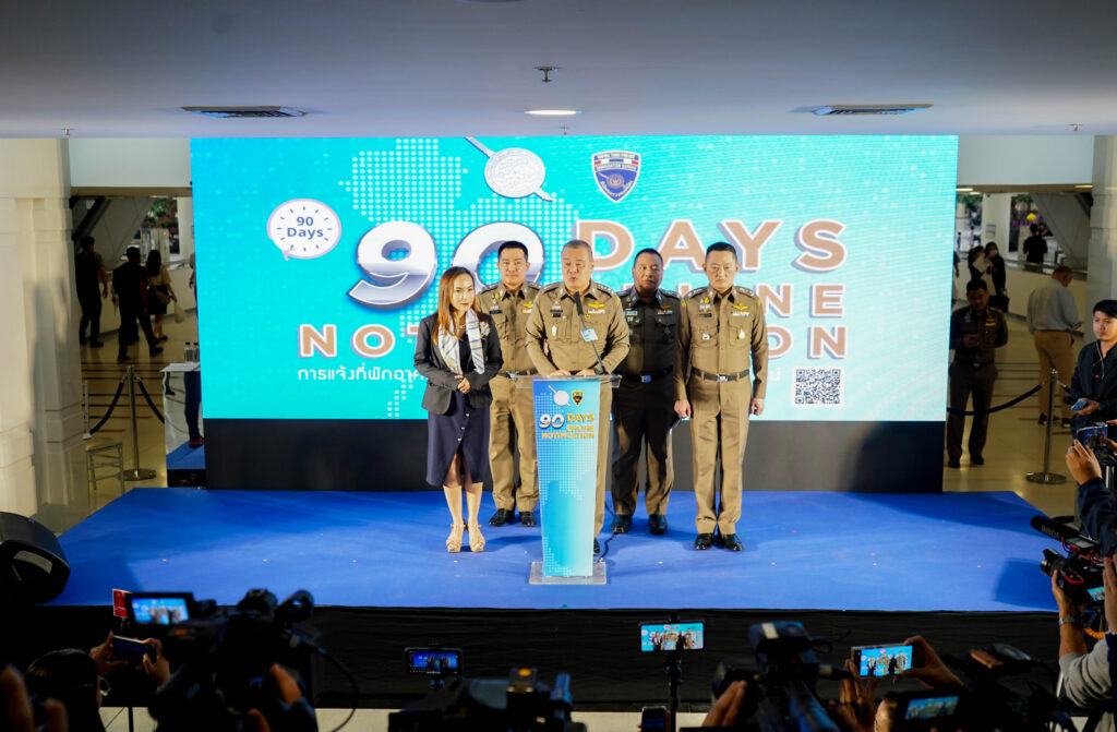 เวลา 10.00 น.วันที่ 22 มกราคม พ.ศ.2567 ณ โถงทางเข้ากองบังคับการตรวจคนเข้าเมือง 1 ประตู 2 อาคารรัฐประศาสนภักดี (อาคารบี) ศูนย์ราชการฯแจ้งวัฒนะ แขวงทุ่งสองห้อง เขตหลักสี่ กรุงเทพฯ พล.ต.ท.อิทธิพล อิทธิสารรณชัย ผบช.สตม. และผู้แทนจากหน่วยงานที่เกี่ยวข้อง ร่วมแถลงข่าวเปิดตัวบริการ 90 days online notification การแจ้งที่พักอาศัยเมื่ออยู่ในราชอาณาจักรเกิน 90 วัน ออนไลน์