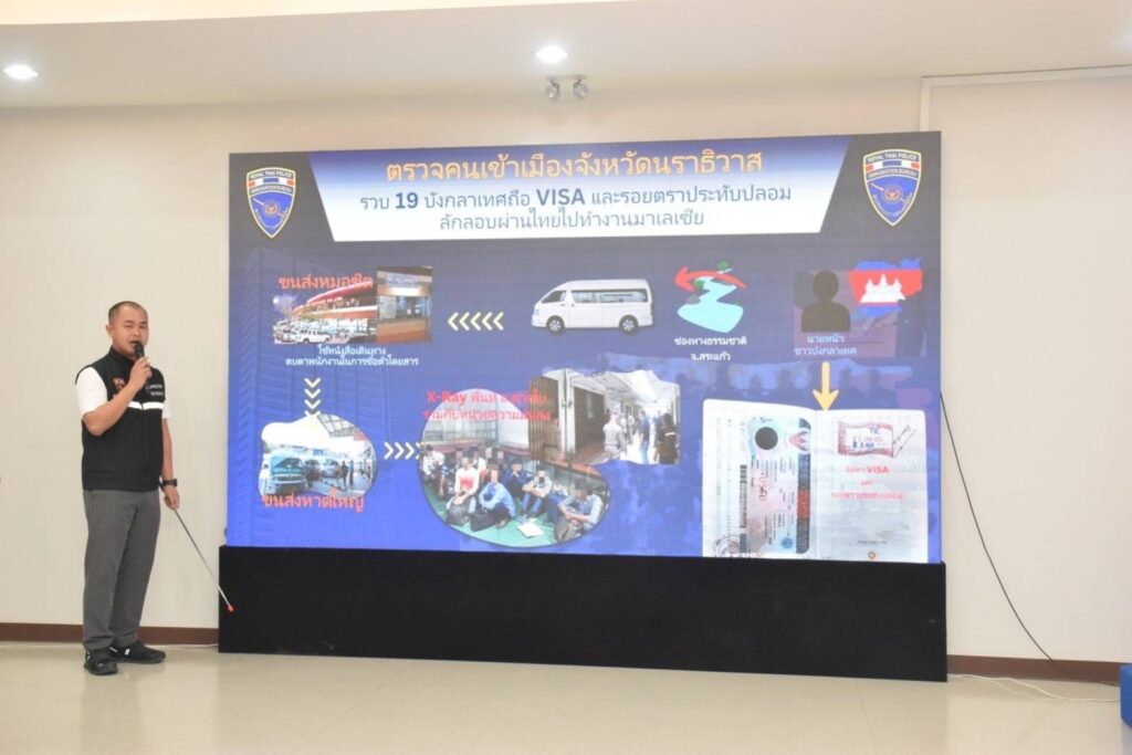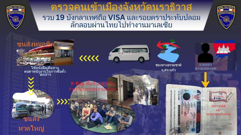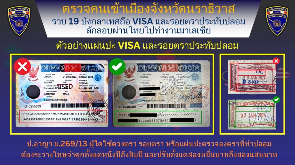 ยังมีคนต่างด้าวอยู่ภายในตัวอาคารพาณิชย์หลังดังกล่าวอีก เจ้าหน้าที่ชุดจับกุมจึงได้ให้คนต่างด้าวดังกล่าวพาเข้าไปตรวจสอบ เมื่อเข้าไปภายในตัวอาคารพบคนต่างด้าวอยู่ภายในอีกจำนวน 18 คน โดยผลการตรวจสอบหนังสือเดินทางทั้ง 19 คน เป็นหนังสือเดินทางประเทศบังกลาเทศทั้งหมด พบว่ามีรอยตราประทับขาเข้าของด่านตรวจคนเข้าเมืองท่าอากาสยานสุวรรณภูมิ รหัส A0370 ระบุวันที่ 2 JAN 2024 จำนวน 2 เล่ม ระบุวันที่ 8 JAN 2024 จำนวน 15 เล่ม ระบุวันที่ 9 JAN 2024 จำนวน 2 เล่ม และยังพบว่าทั้ง 19 เล่ม แผ่นปะตรวจลงตรา (Visa) มีลักษณะผิดปกติ จึงได้ตรวจสอบกับระบบเทคโนโลยีสารสนทศ ตม. ผลการตรวจสอบไม่ปรากฏข้อมูลการเดินทางเข้าราชอาณาจักรแต่อย่างใด จึงได้นำตัวมาตรวจสอบที่ สภ.ตากใบ จากการสอบถามชาวบังกลาเทศทั้ง 19 คน รับว่าพวกตนได้เดินทางมาจากประเทศบังกลาเทศและพักอาศัยอยู่ประเทศกัมพูชา โดยมีชาวบังกลาเทศที่อยู่ในประเทศกัมพูชาคอยช่วยเหลือสนับสนุนที่พัก รวมทั้งเอาหนังสือเดินทางของพวกตนไปดำเนินการประทับรอยตราประทับขาเข้าประเทศไทยให้ และนำมาคืนก่อนที่จะพาพวกตนลักลอบข้ามพรมแดนมายังประเทศไทยเพื่อจะเดินทางไปยังประเทศมาเลเชียแต่ถูกจับกุมเสียก่อน โดยได้จ่ายค่าเดินทางพร้อมค่าใช้จ่ายการประทับตราขาเข้าประเทศไทยให้กับนายหน้าแล้วทั้งหมดที่ประเทศบังกลาเทศ เป็นเงินจำนวนคนละ 400,000 – 500,000 ทากา คิดเป็นเงินไทยประมาณ 145,000 บาท เจ้าหน้าที่ชุดจับกุมจึงได้แจ้งข้อกล่าวหาและจับกุมนำตัวส่งพนักงานสอบสวน สภ.ตากใบ เพื่อดำเนินคดีตามข้อกล่าวหาดังกล่าวในขั้นต่อไป