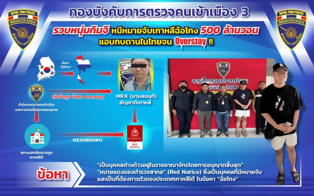 เมื่อประมาณต้นเดือน มกราคม 2567 กก.สส.บก.ตม.3 ได้สืบสวนทราบว่ามีคนต่างด้าวสัญชาติเกาหลีใต้ มีพฤติการณ์น่าสงสัยซึ่งอาจเป็นผู้กระทำผิดกฎหมาย จึงได้สืบสวนข้อมูลในเชิงลึกพบว่า MR.K (นามสมมติ) อายุ 43 ปี โดยได้เดินทางเข้ามาในประเทศไทย เมื่อเดือนเมษายน 2566 และอยู่ในประเทศไทยจนกระทั่งการอนุญาตสิ้นสุด (Overstay) โดยไม่ดำเนินการขออยู่ต่อในราชอาณาจักรให้ถูกต้องตามกฎหมาย จึงรายงานให้ผู้บังคับบัญชาทราบ และได้ขอให้สถานเอกอัครราชทูตสาธารณรัฐเกาหลีใต้ ประจำประเทศไทย ตรวจสอบประวัติของ MR.K รับแจ้งว่า MR.K เป็นบุคคลที่มีหมายจับและเป็นที่ต้องการตัวของประเทศเกาหลีใต้ ในข้อหา “ฉ้อโกง” มูลค่าความเสียหายกว่า 500 ล้านวอน (12 ล้านบาท) และองค์การตำรวจสากลได้ออกประกาศสีแดง (INTERPOL RED NOTICE) กก.สส.บก.ตม.3 จึงได้จัดกำลังเจ้าหน้าที่ตำรวจสืบสวน ติดตาม เพื่อจับกุมตัว MR.K