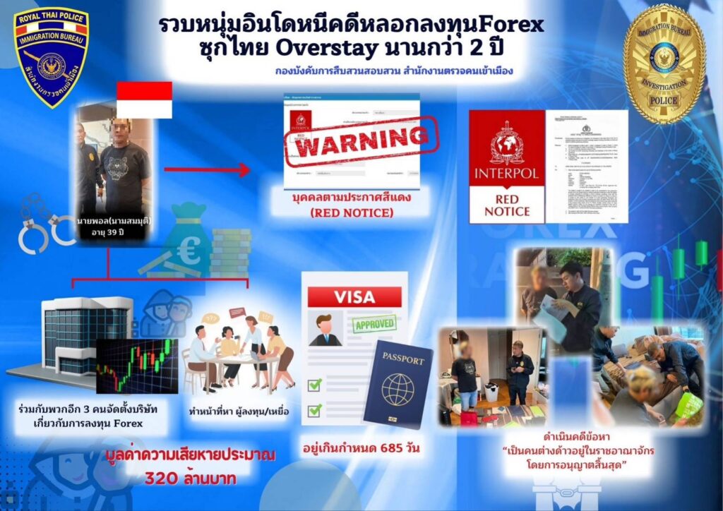 พฤติการณ์จับกุม เจ้าหน้าที่ตำรวจ บก.สส.สตม, ได้ทำการตรวจสอบข้อมูลในระบบเทคโนโลยีสารสนเทศ ตม. พบว่า นายพอล (นามสมมติ) อายุ 39 ปี สัญชาติอินโดนีเซีย การอนุญาตให้อยู่ในราชอาณาจักรสิ้นสุด (Overstay) นานกว่า 2 ปี และเป็นบุคคลที่องค์การตำรวจสากลได้ออกประกาศสีแดง (INTERPOL RED NOTICE) จึงได้ประสานงานไปยังเจ้าหน้าที่ กงสุลฝ่ายตำรวจ สาธารณรัฐอินโดนีเชีย ประจำประเทศไทย รับแจ้งว่า นายพอล เป็นผู้ต้องหาตามหมายจับของสาธารณรัฐอินโตนีเซีย กระทำความผิดในข้อหา ฉ้อโกง โดยการหลอกให้ผู้เสียหายร่วมลงทุน Forex มูลค่าความเสียหายคิดเป็นเงินไทยประมาณ 320 ล้านบาท และปัจจุบันยังหลบหนีคดีเป็นที่ต้องการตัวของทางการอินโดนีเซีย