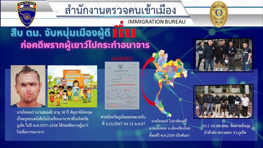 บก.สส.สตม. จับกุมนายไทเลอร์ (นามสมมติ) อายุ 38 ปี สัญชาติอังกฤษ ตามหมายจับศาลจังหวัดภูเก็ต ที่ จ.21/2567 ลงวันที่ 12 มกราคม 2567 ซึ่งต้องหาว่ากระทำความผิดฐาน พรากผู้เยาว์อายุกว่าสิบห้าปีแต่ยังไม่เกิน สิบแปดปีไปเสียจากบิดา มารดา ผู้ปกครอง หรือผู้ดูแล โดยปราศจากเหตุสมควรเพื่อการอนาจาร นำตัวส่งพนักงานสอบสวน สภ.ฉลอง จว.ภูเก็ต ดำเนินคดีตามกฎหมาย สถานที่จับกุมพื้นที่ ต.หนองหอย อ.เมืองเชียงใหม่ จว.เชียงใหม่